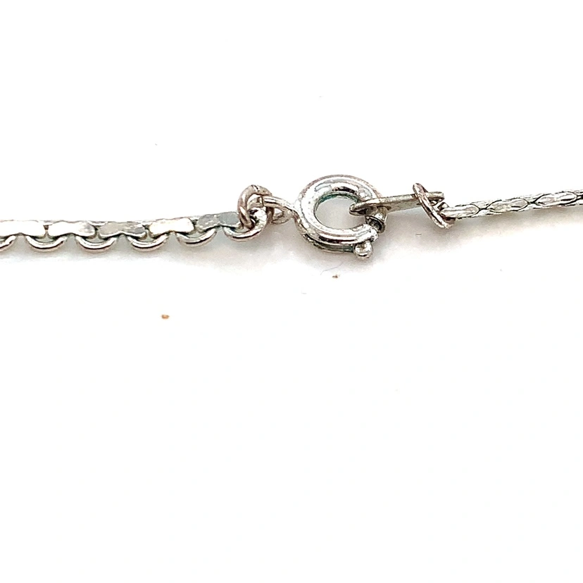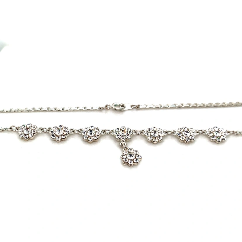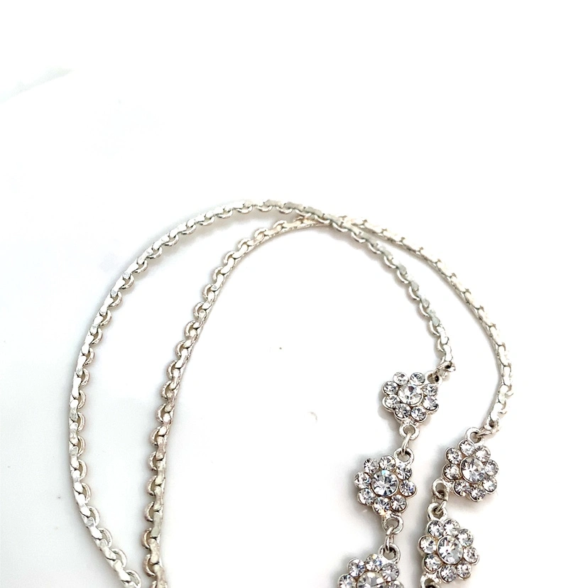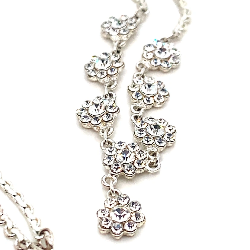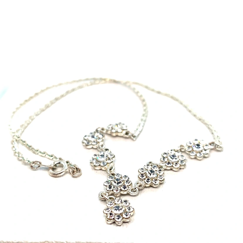 Silver chain with crystal flower accents. Very sparkly and pretty. It’s a choker style almost, about 15” in length