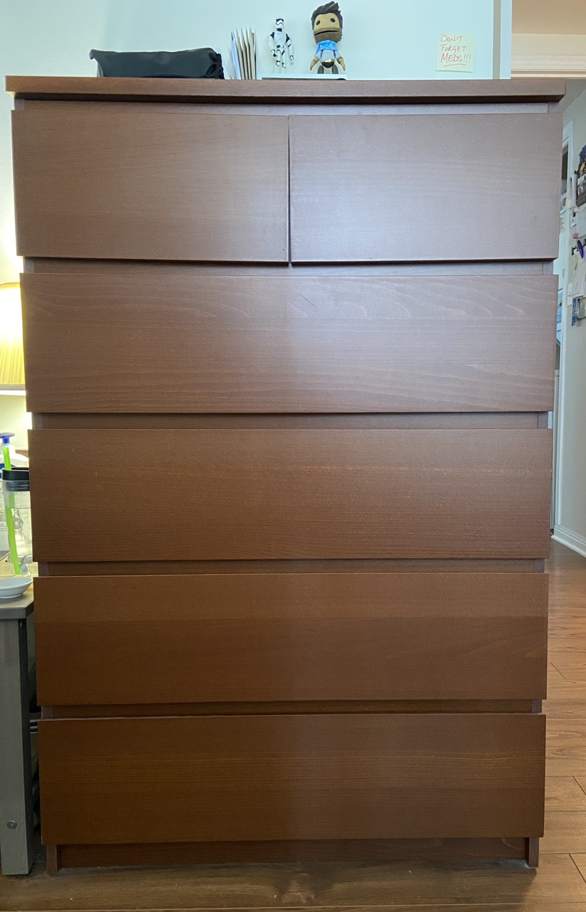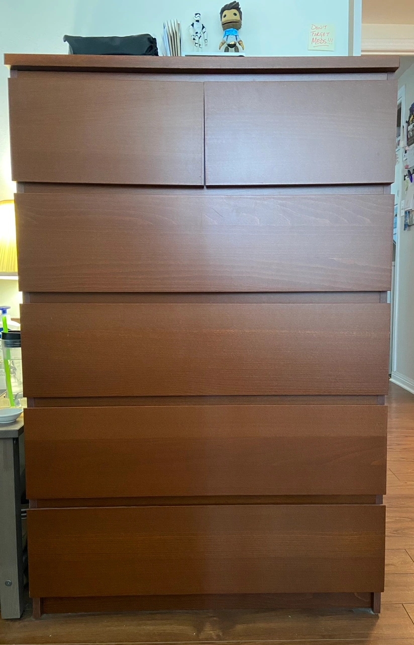 6-drawer chest with brown finish. Good condition. 32in wide / 49in height / 19 in depth