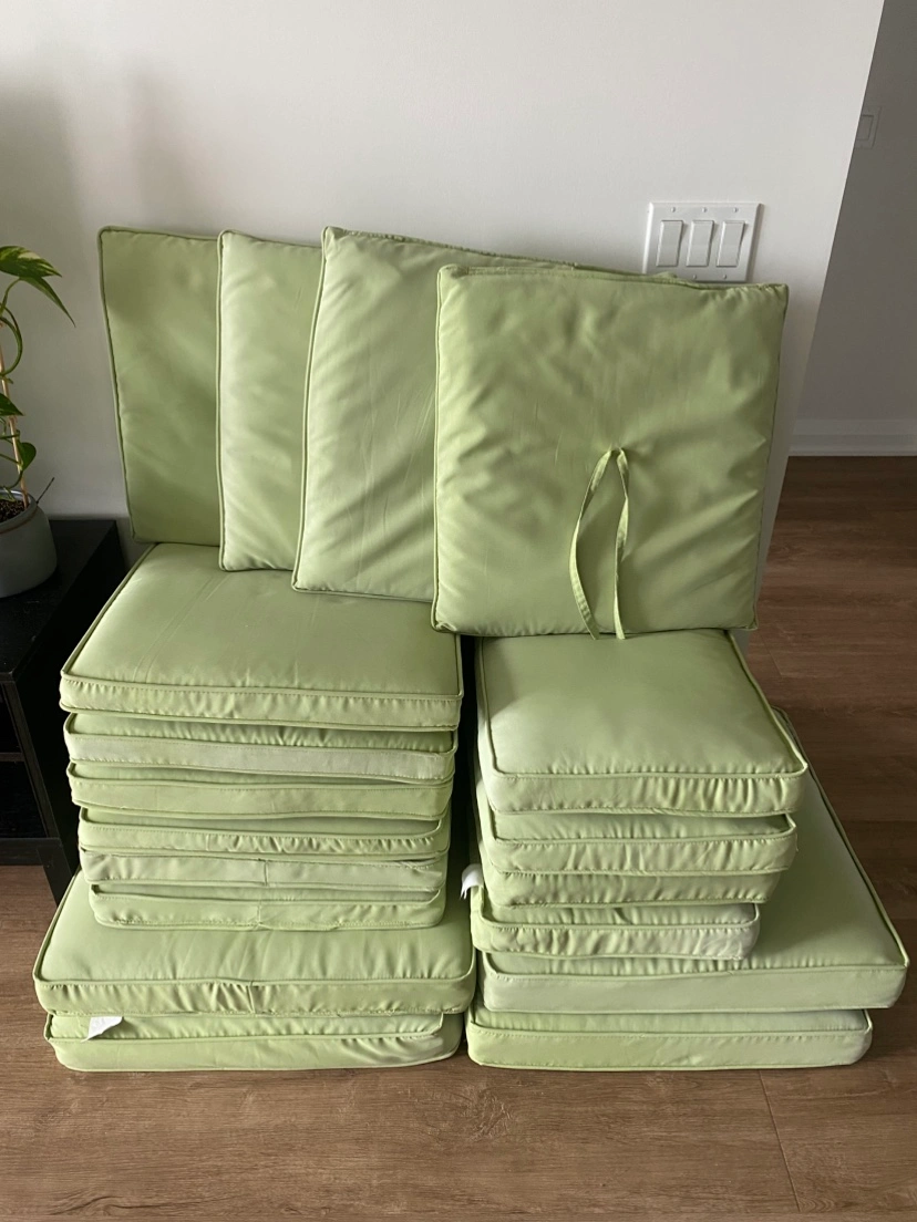 Set of 18 cushions in a light green colour. Comes in 4 different sizes. Used but still in good clean condition. Two of them have some minor stains and small holes. One side losed color because of the sun.
