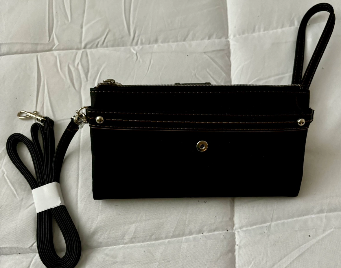 Black leather wristlet wallet with a long crossbody strap that can be used as a shoulder bag. It has multiple pockets and compartments.