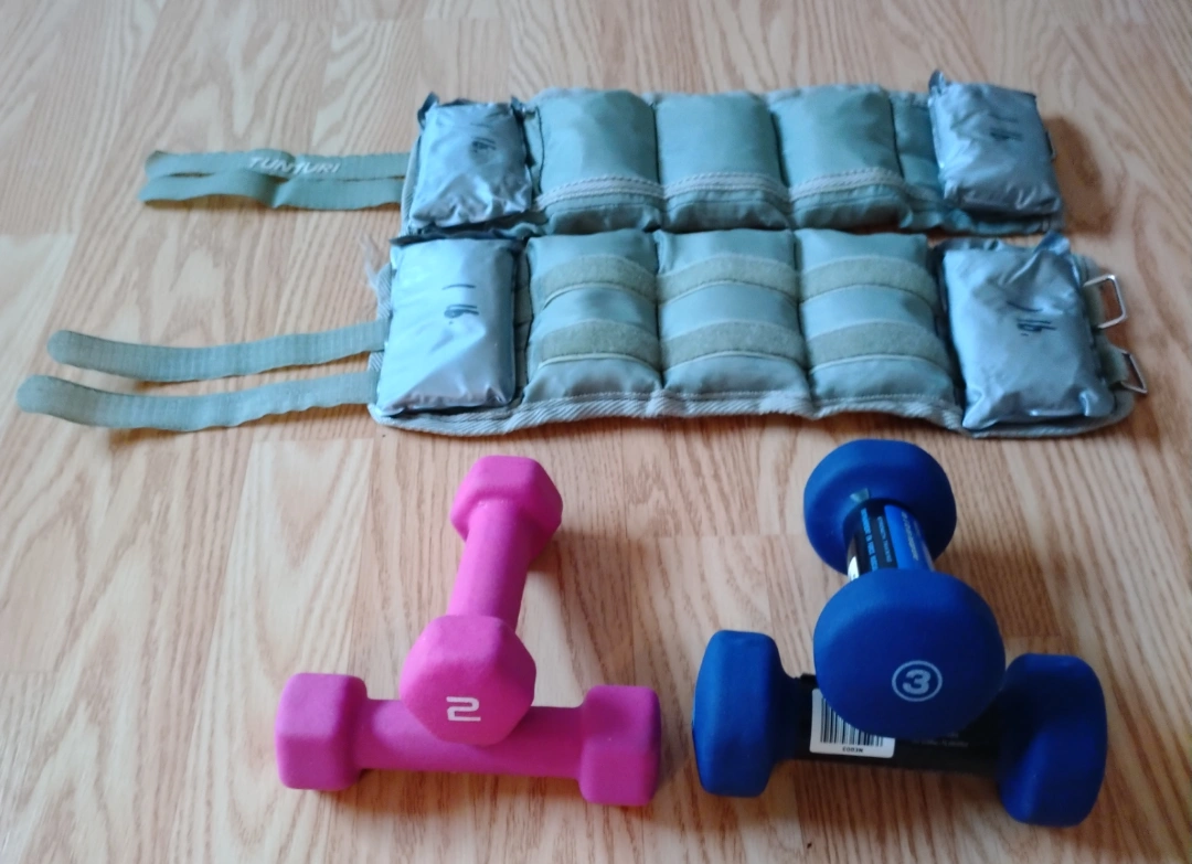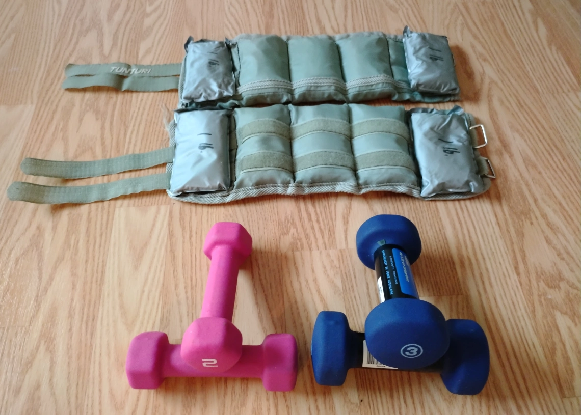 Pair of ankle weights that can be adjusted from 1 (one) to 5 (five) pounds.