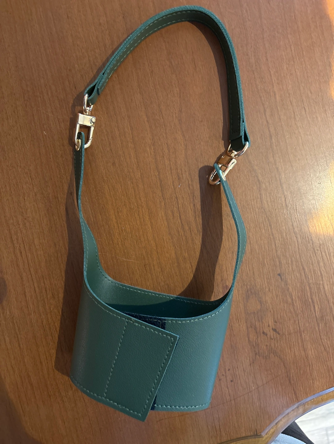 Green leather cup holder with adjustable strap. Great for coffee or tea. It has a gold clasp. Please look at photos. This is an excellent deal!