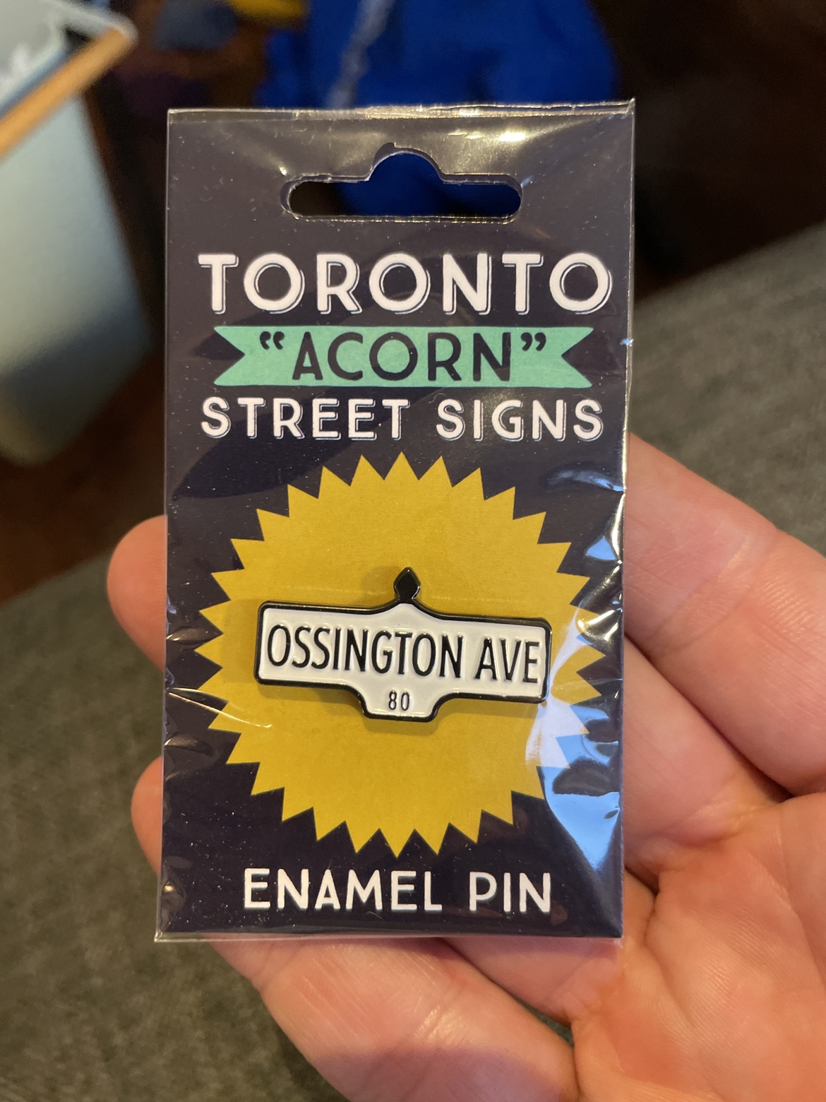 A Toronto "Acorn" street sign enamel pin featuring Ossington Avenue.