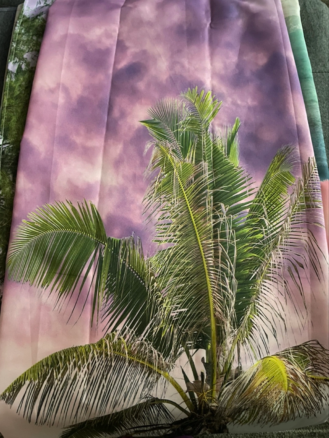 A printed shower curtain with a palm tree on a cloudy sunset background Had it up for a month and then changed it, has been sitting in my closet ever since