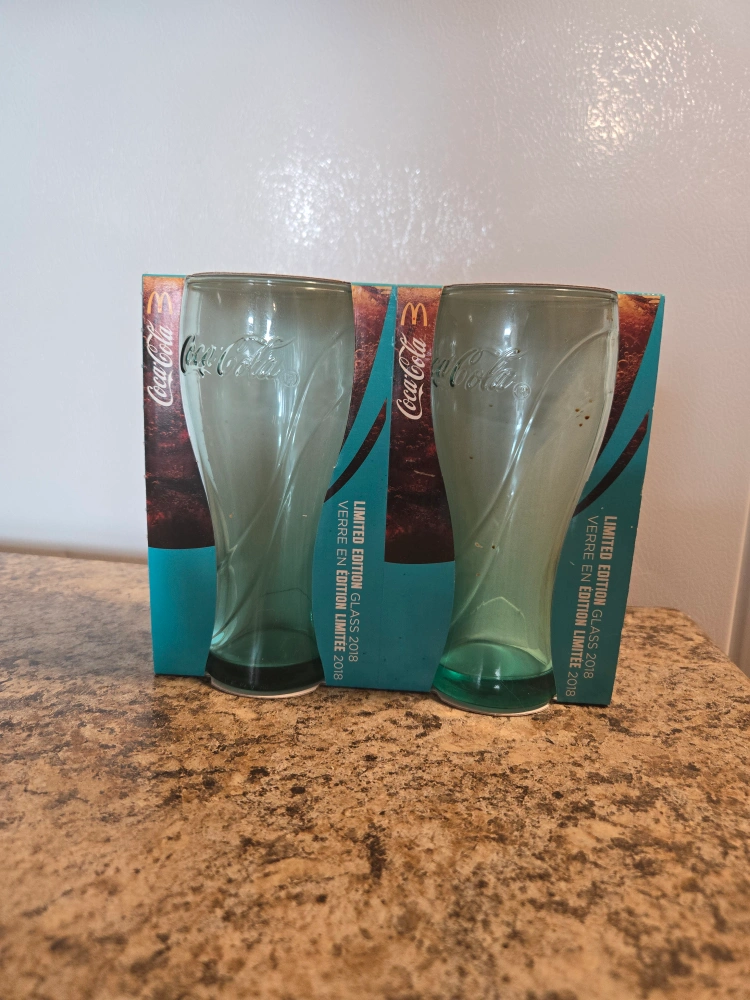 Two Coca Cola glasses in the limited edition 2018 design. New in box never used