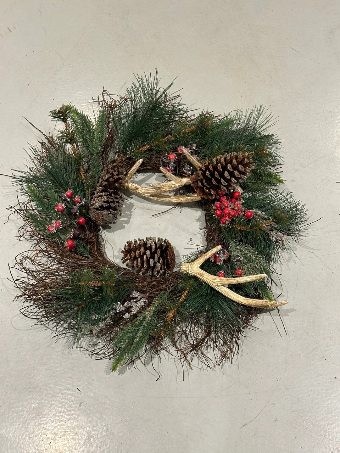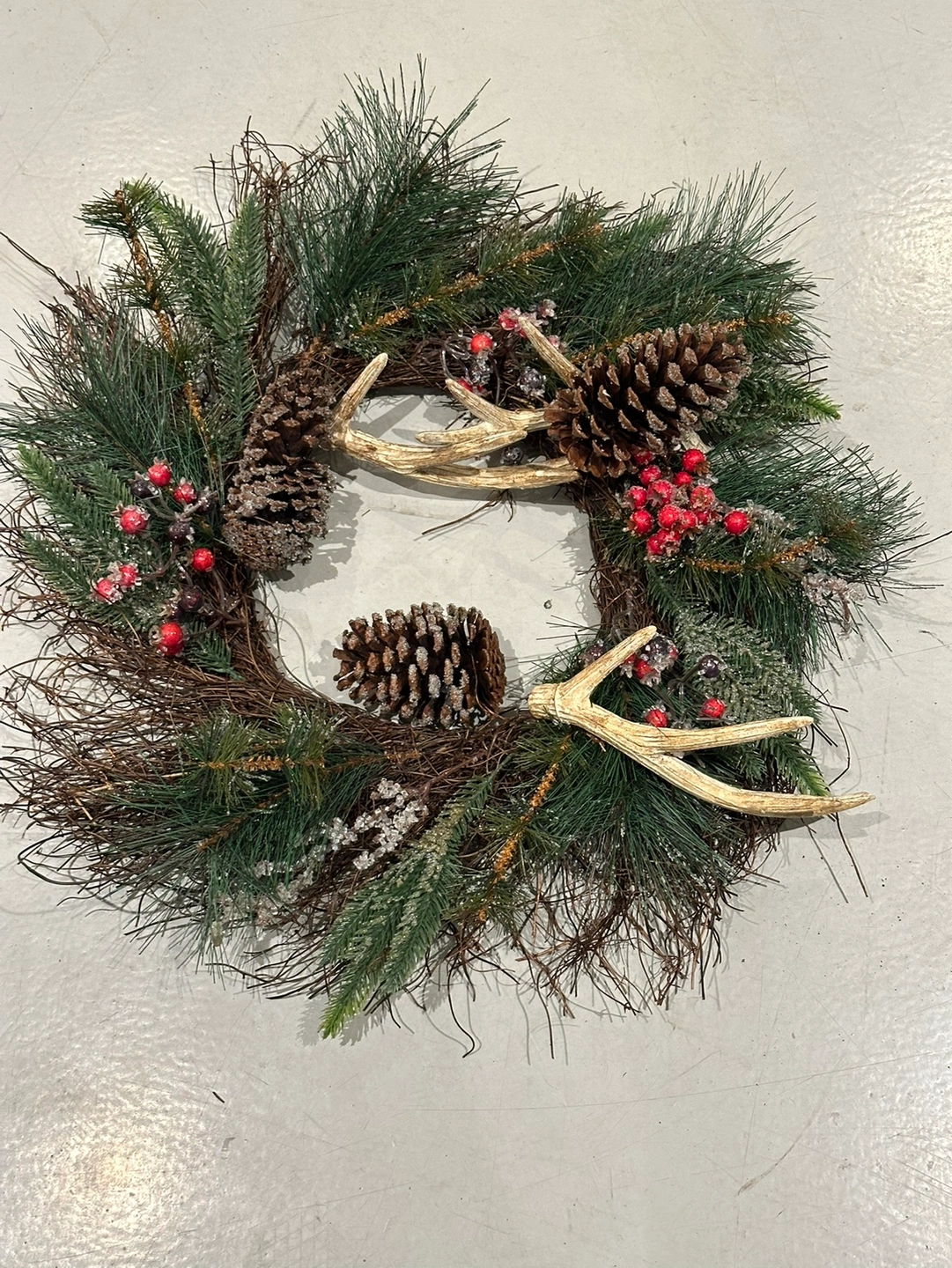486This Christmas wreath features pine boughs, pine cones, antlers, and red berries. It is approximately 20 inches in diameter.
