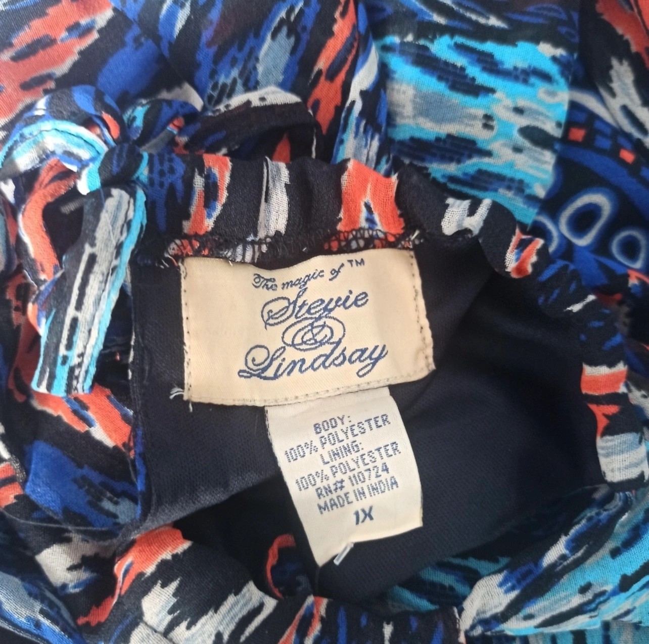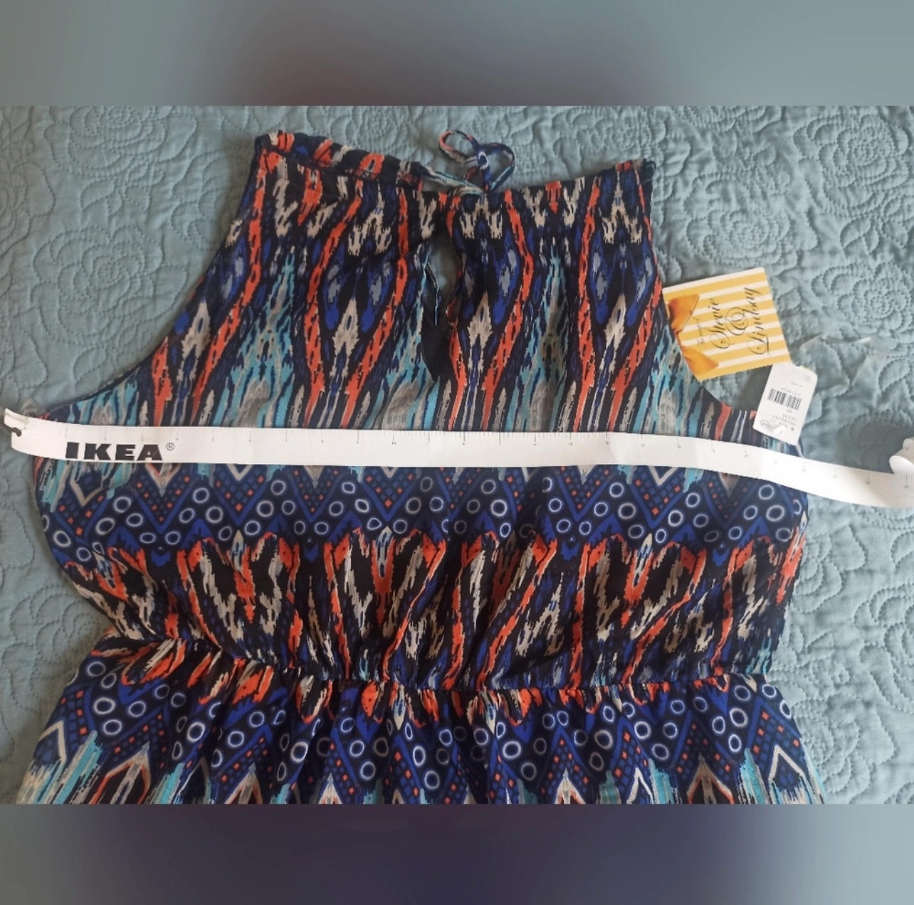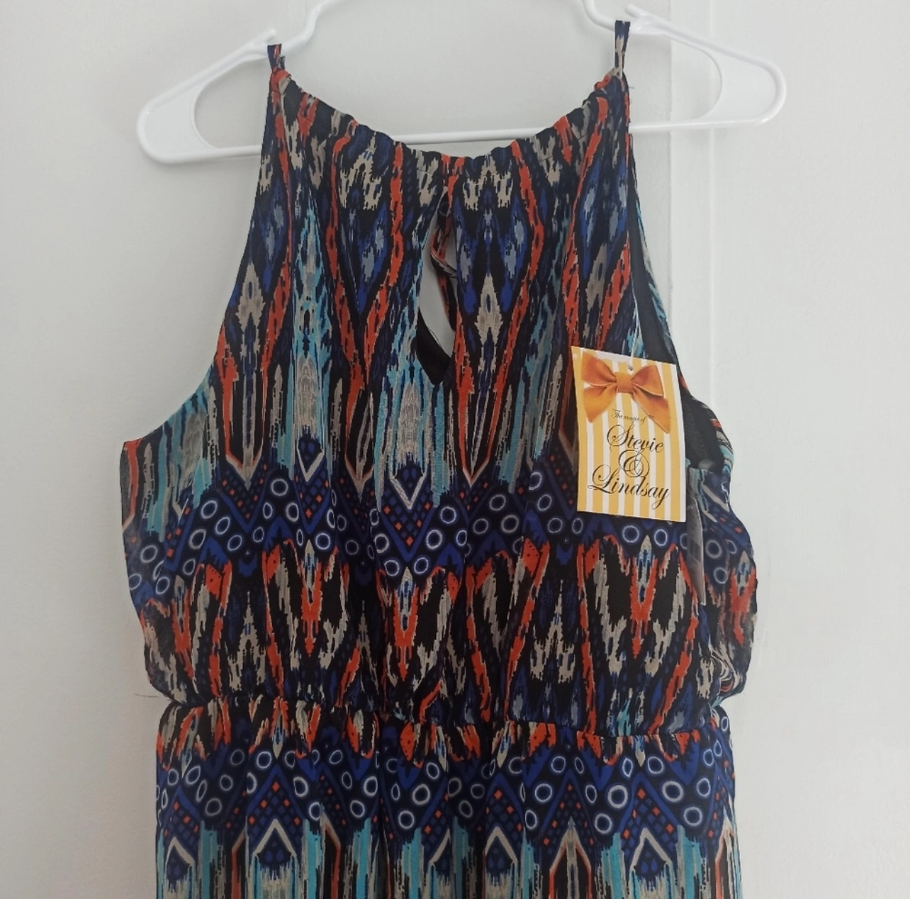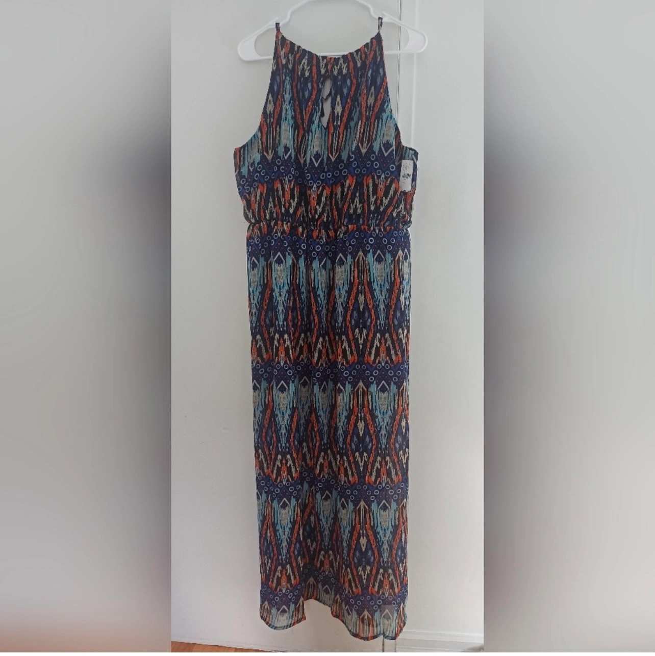 Beautiful blue, orange, and brown patterned maxi dress with a keyhole back and a fitted waist. The dress is sleeveless and has a halter style neckline. It is made of a lightweight, flowy fabric.