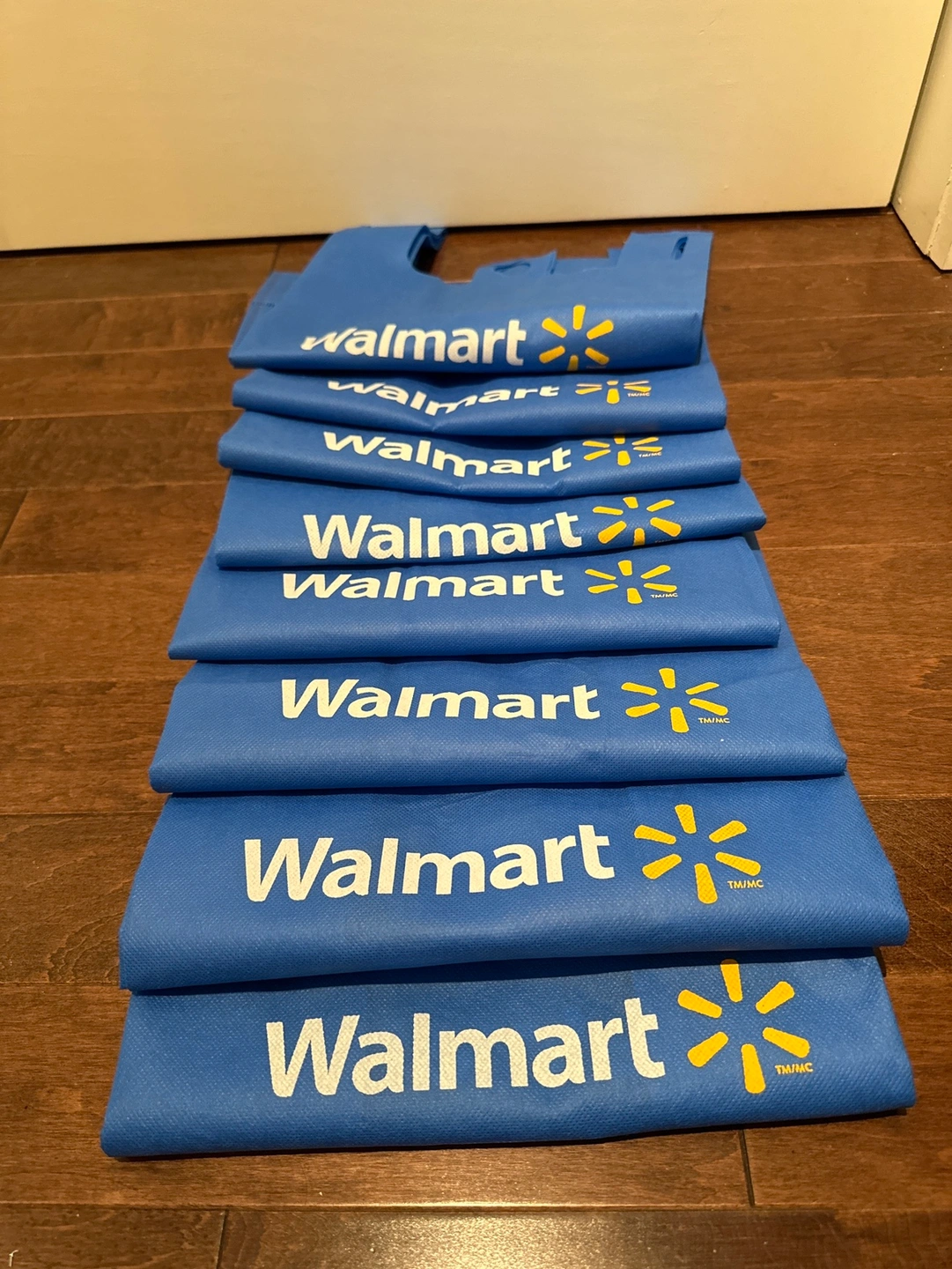 A stack of 8 reusable blue Walmart shopping bags. Ordered groceries a couple times and have a bunch of these bags I don’t need.