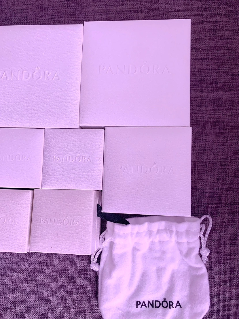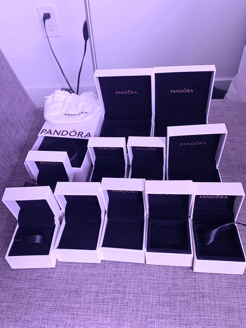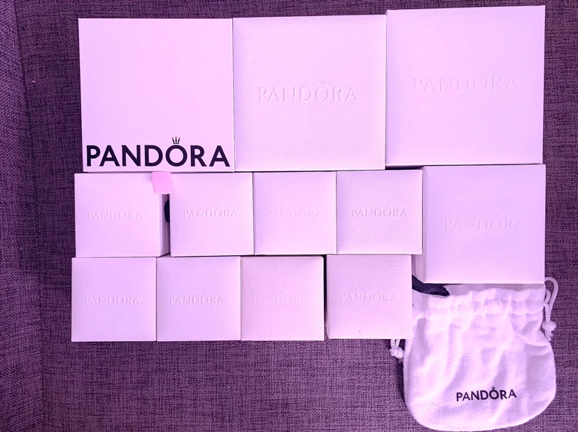 A collection of 12 Pandora jewelry boxes and a pouch. The boxes are all in various sizes and are perfect for storing your Pandora charms, bracelets, rings, or necklaces. The pouch is ideal for keeping your favourite items organized and safe when travelling.