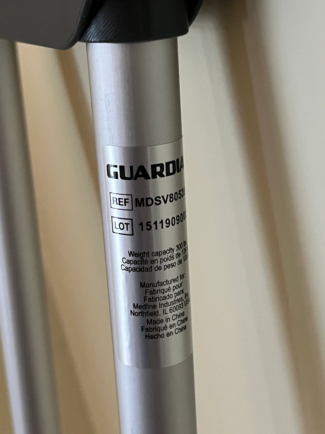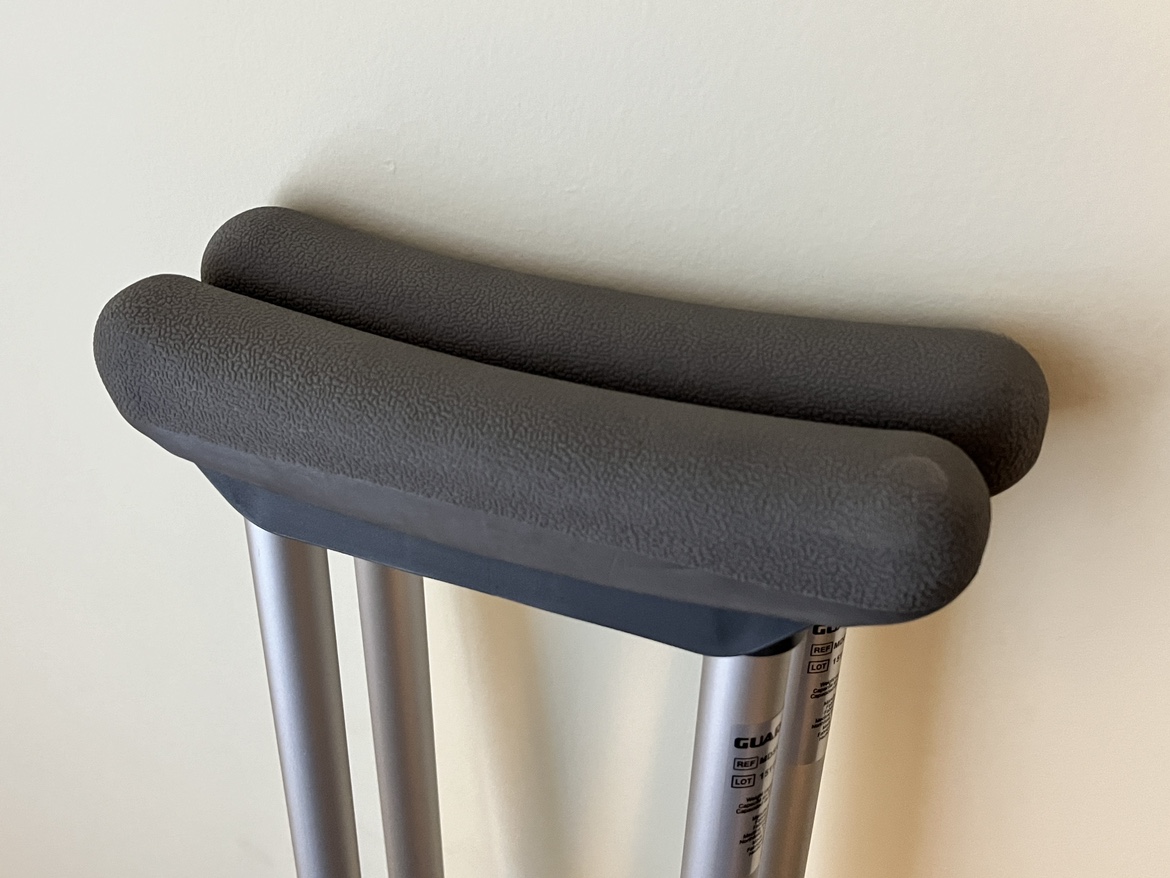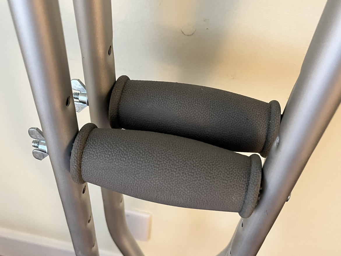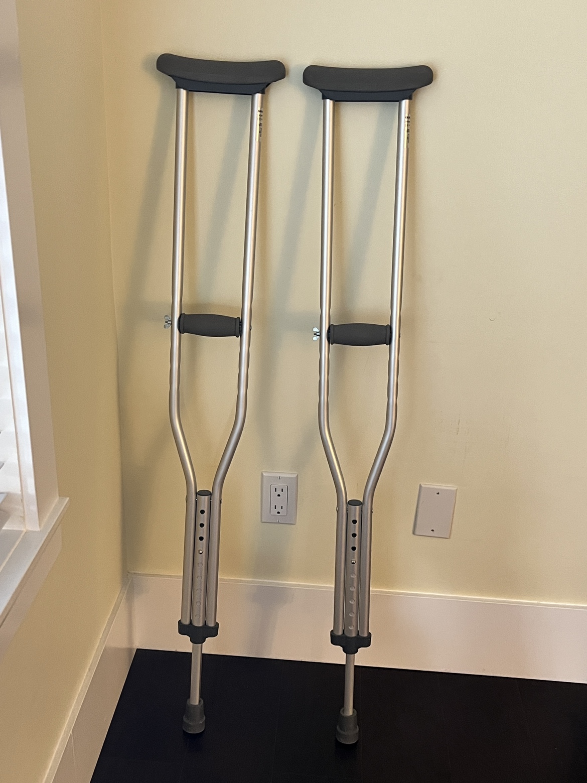 A pair of crutches made of aluminum with adjustable height and rubber tips. They have a comfortable grip with a black rubber pad. They are in used condition.