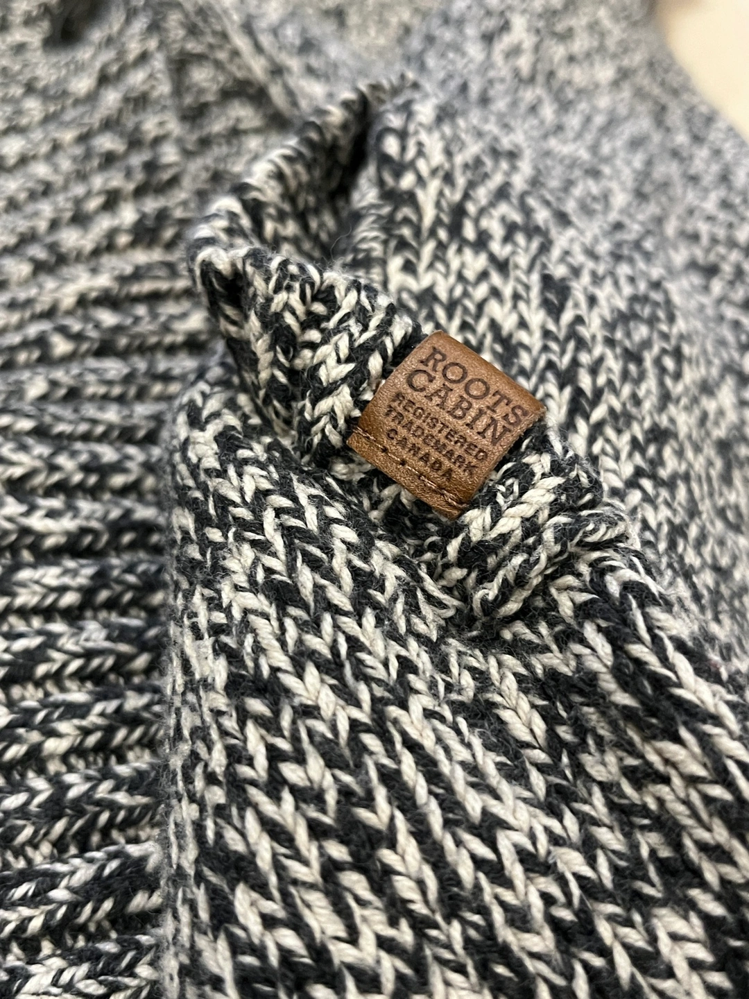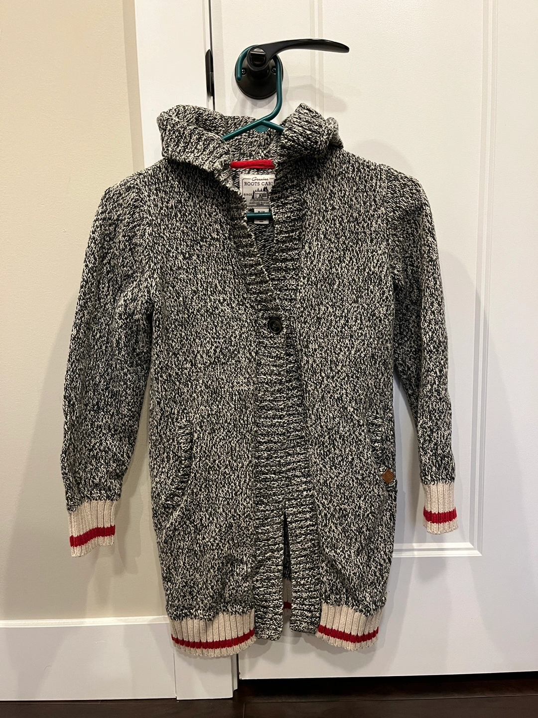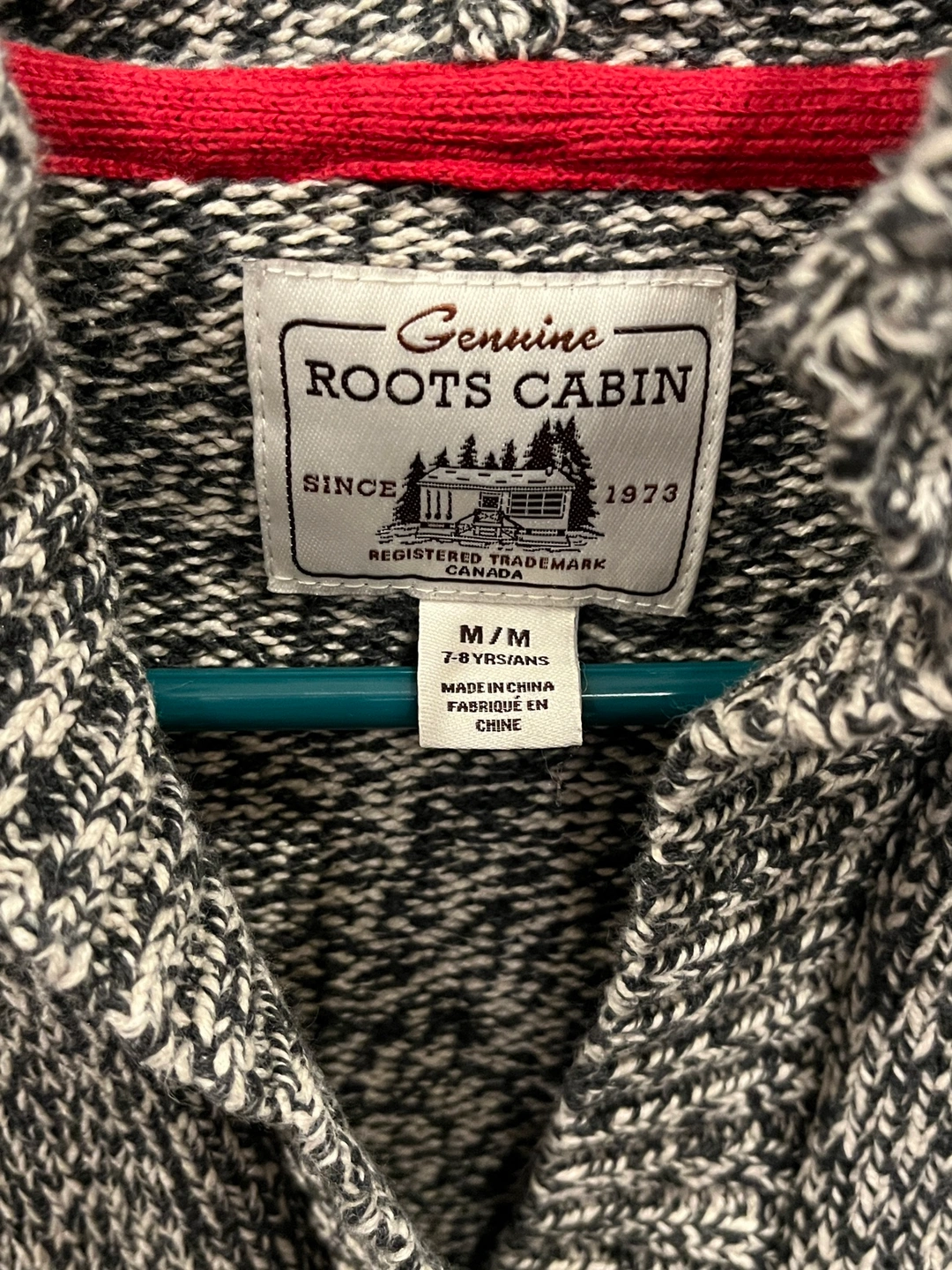 95Black and white hooded cardigan with red and white trim. Size M/M. Made in China. Ages 7-8