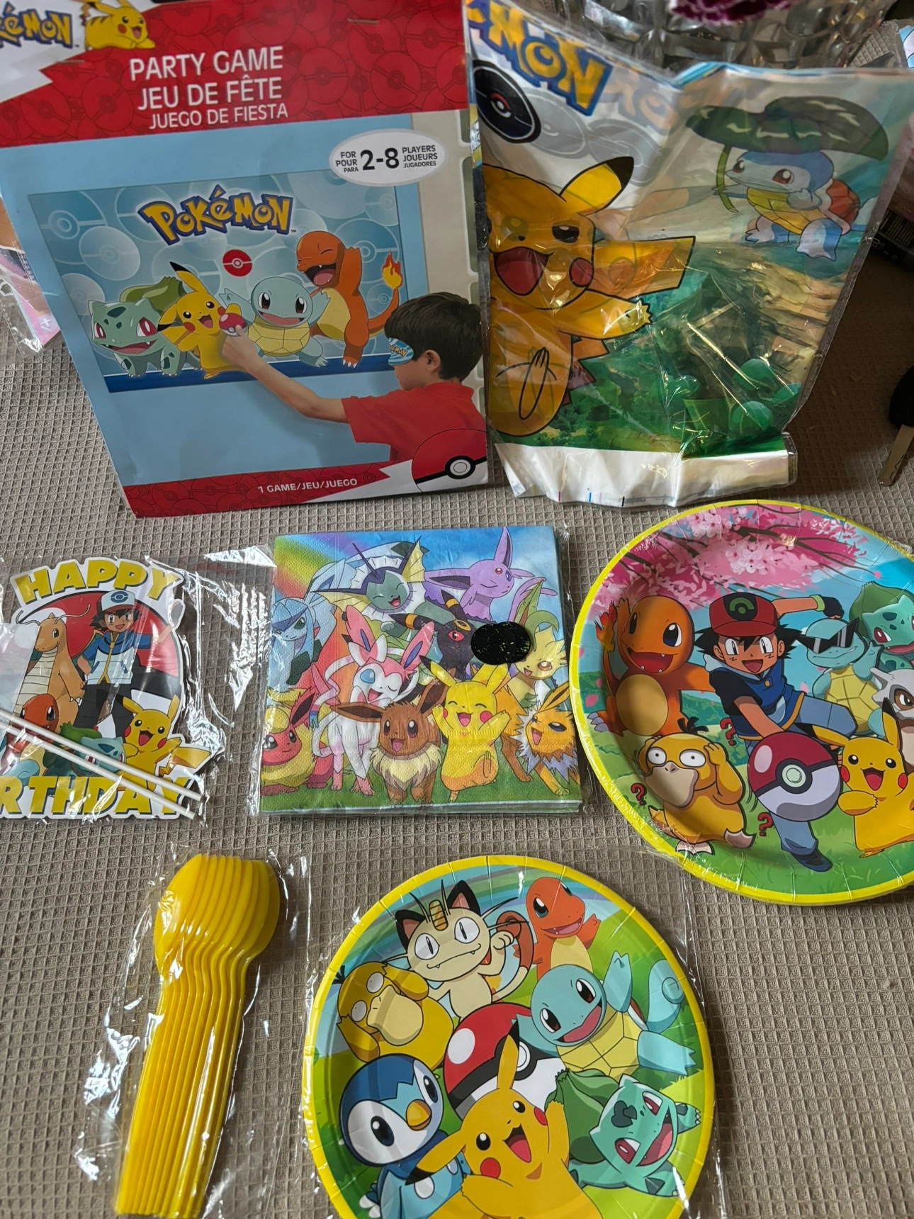 286A set of Pokémon party supplies, including plates, napkins, a birthday cake topper, and a pin the tail on the Pokémon game.