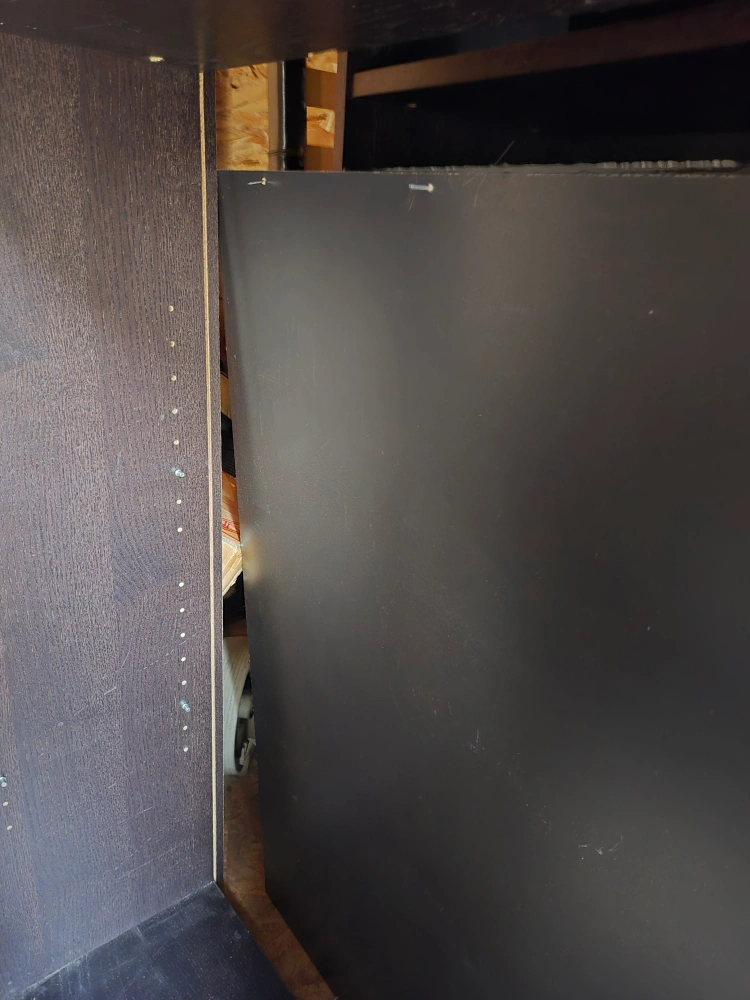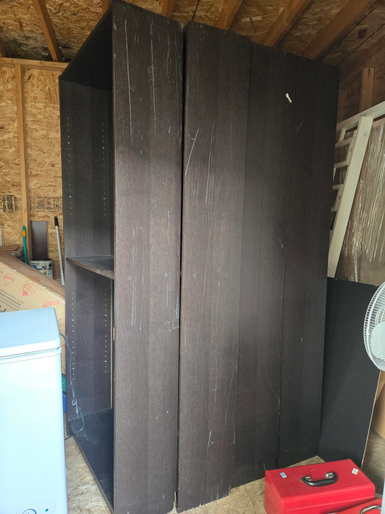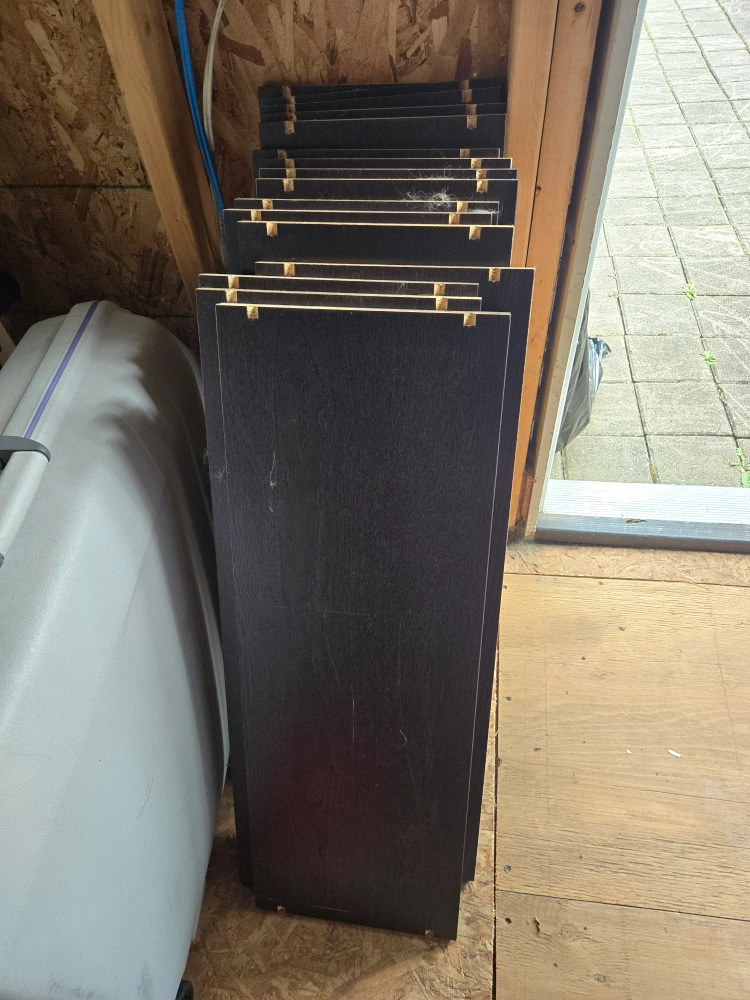 These 4 identical black-brownbook cases are made of particleboard and laminated paper foil. It comes with 6 shelves each. partially disassembled. Scratches on sides.