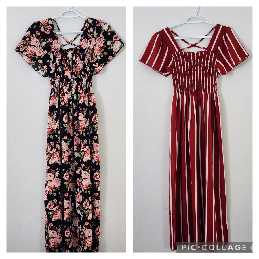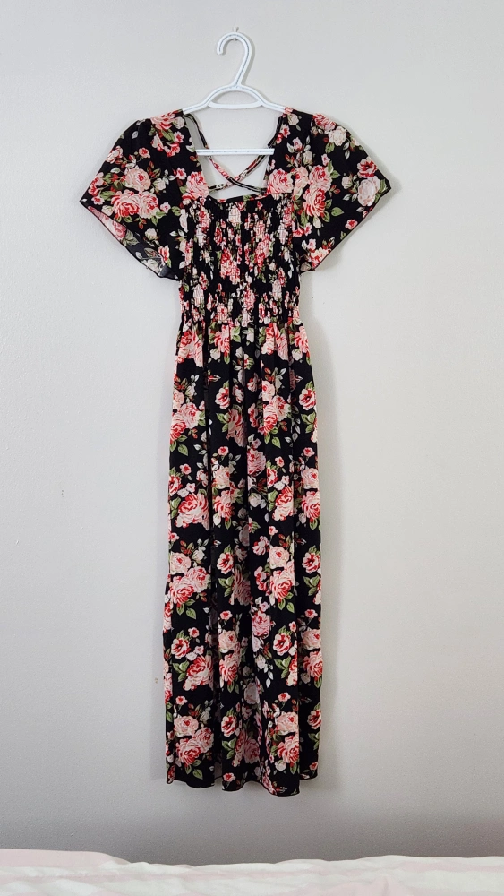 The dress has a smocked waist and an open back with criss-cross straps. It is a lightweight and flowy fabric.