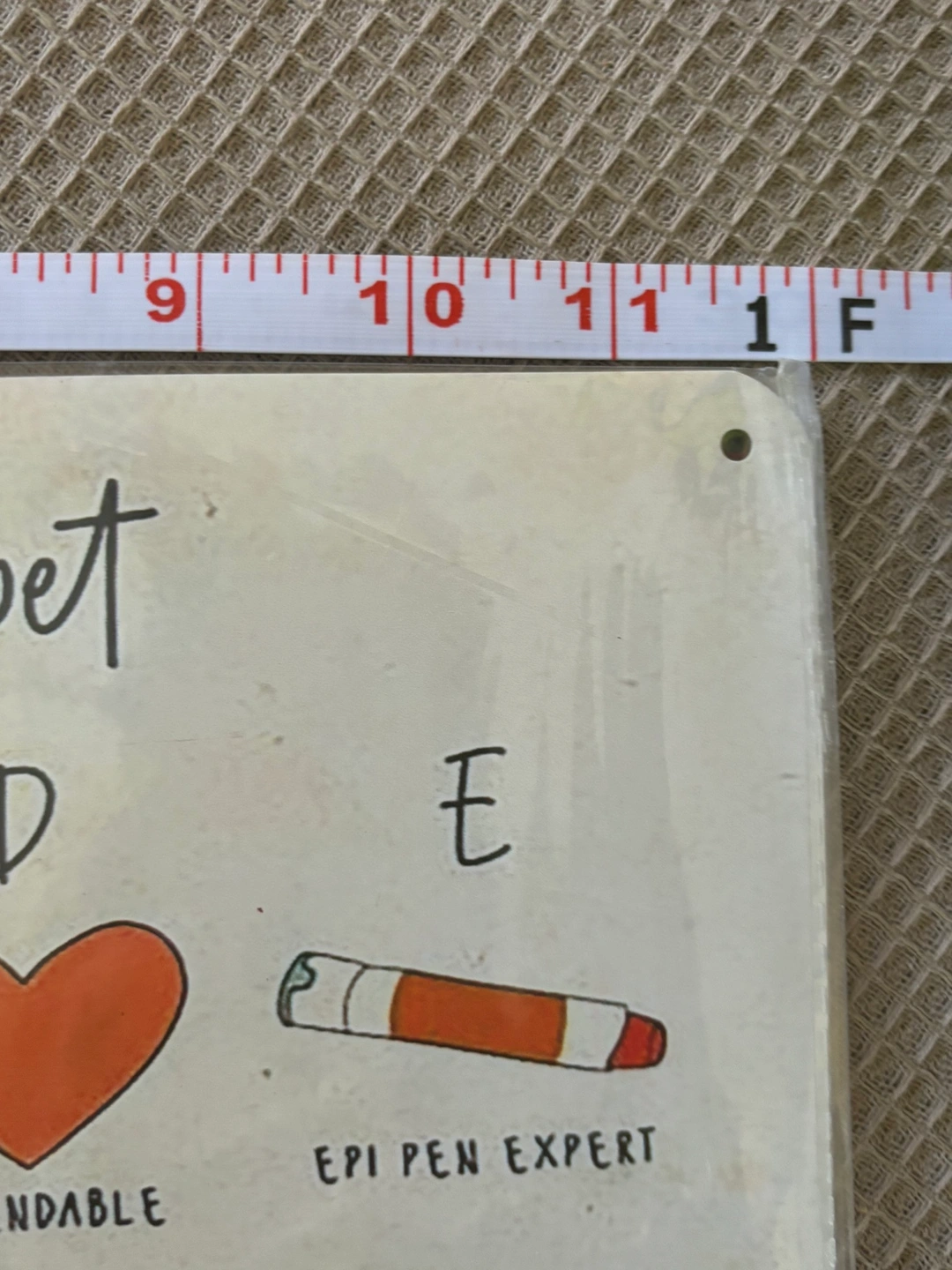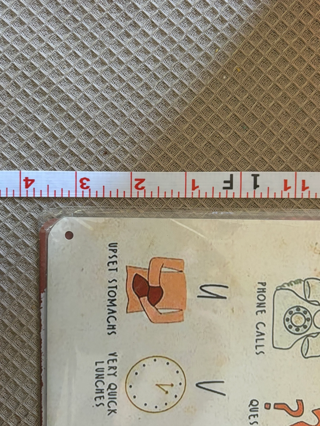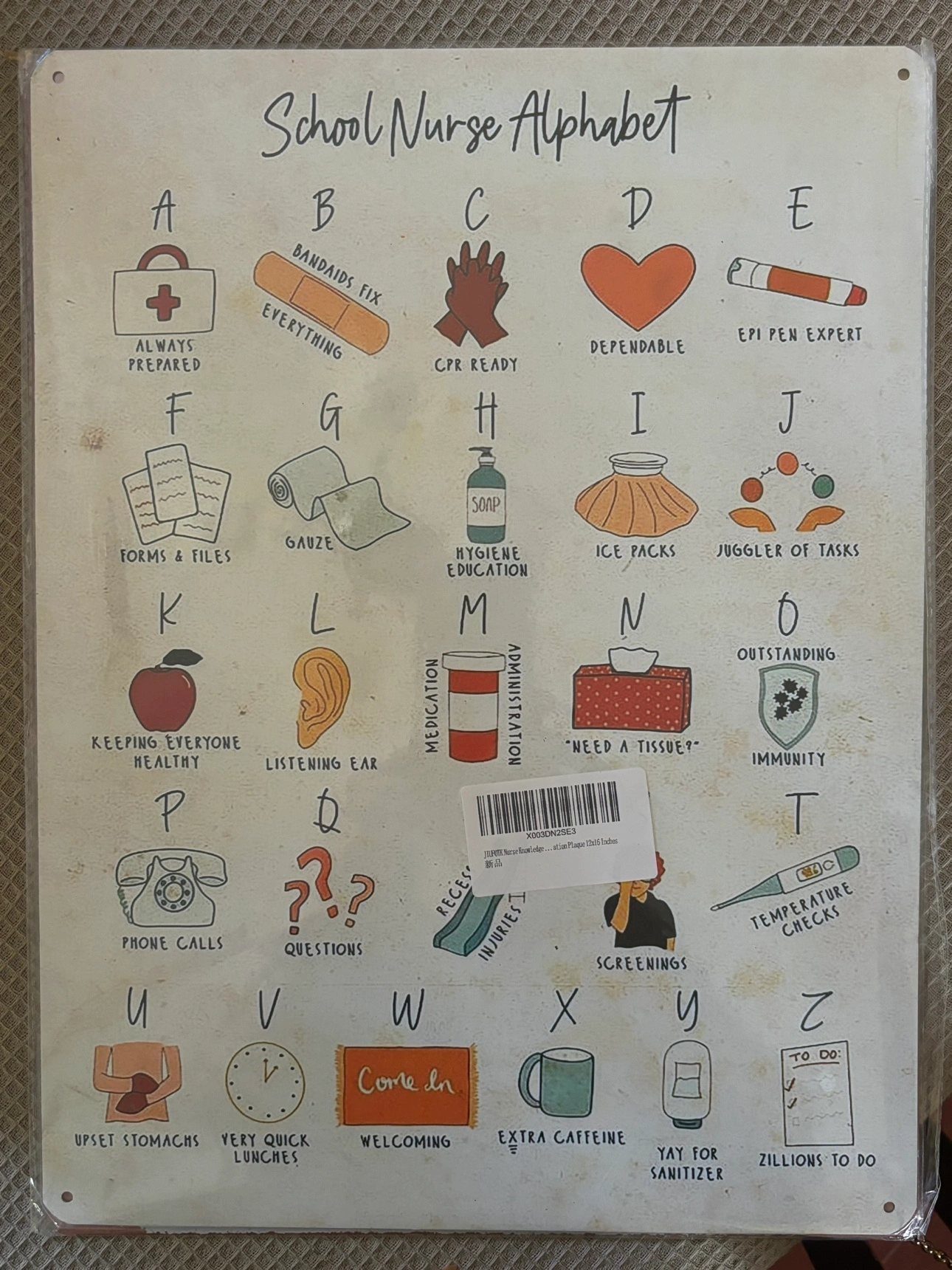 286This is a metal sign featuring a fun alphabet for school nurses. It is 11.5 inches wide and 8.5 inches high.