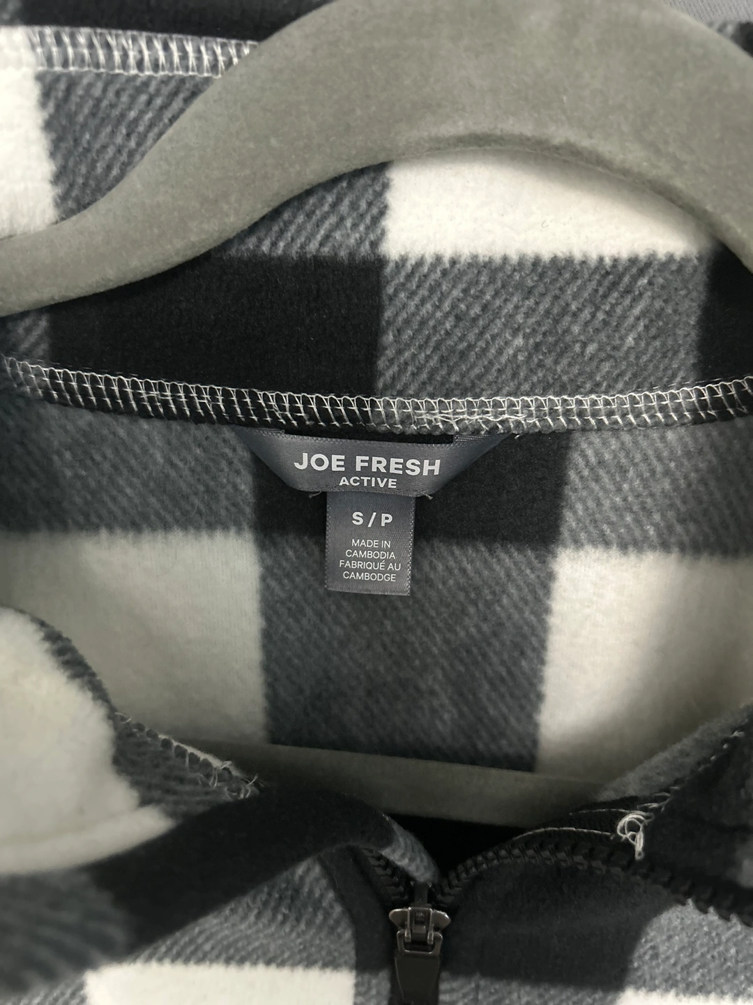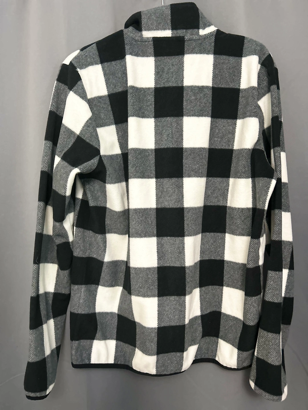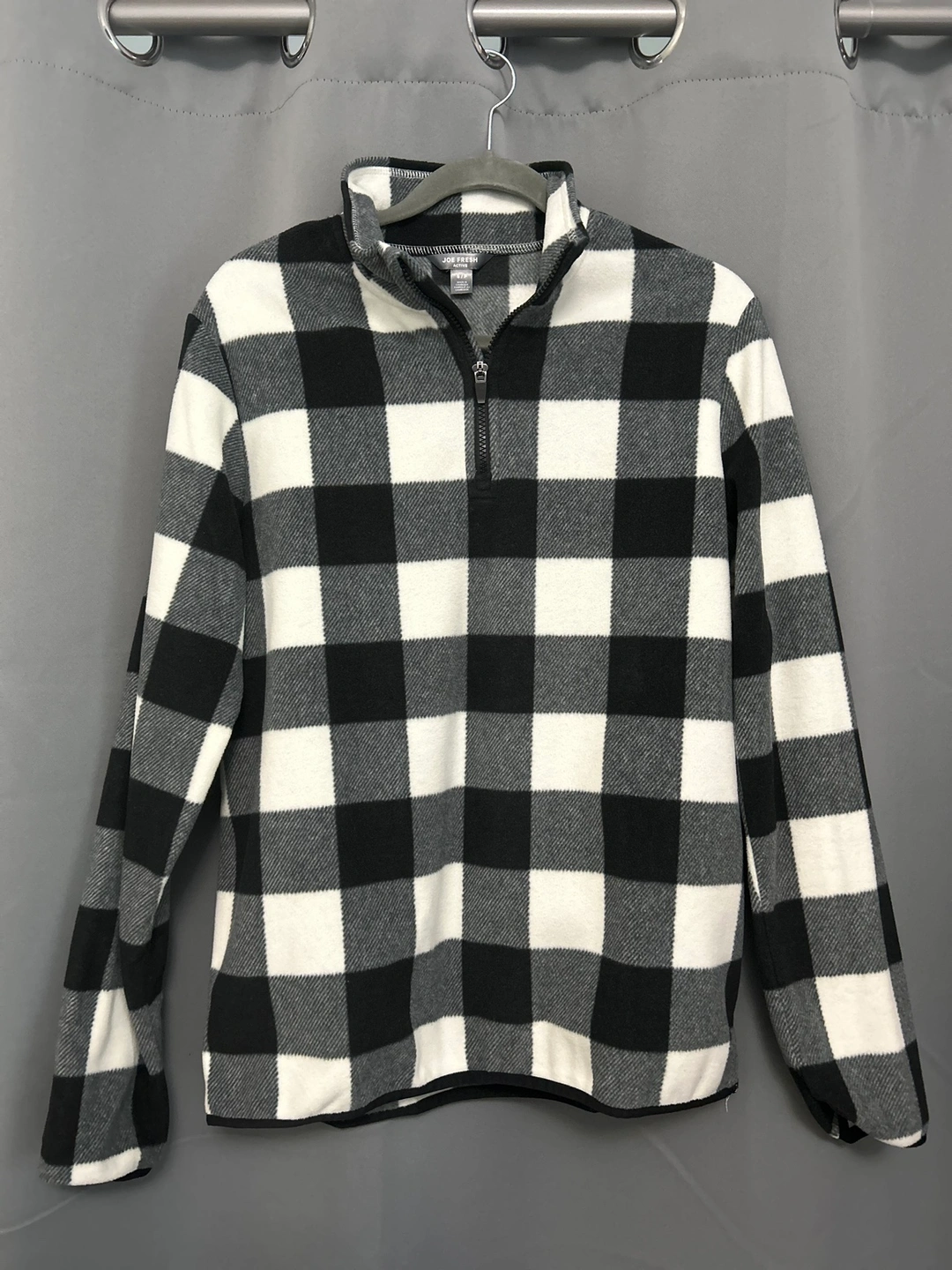 Size small fits to Medium . black and white plaid pullover with 1/4 zip closure.