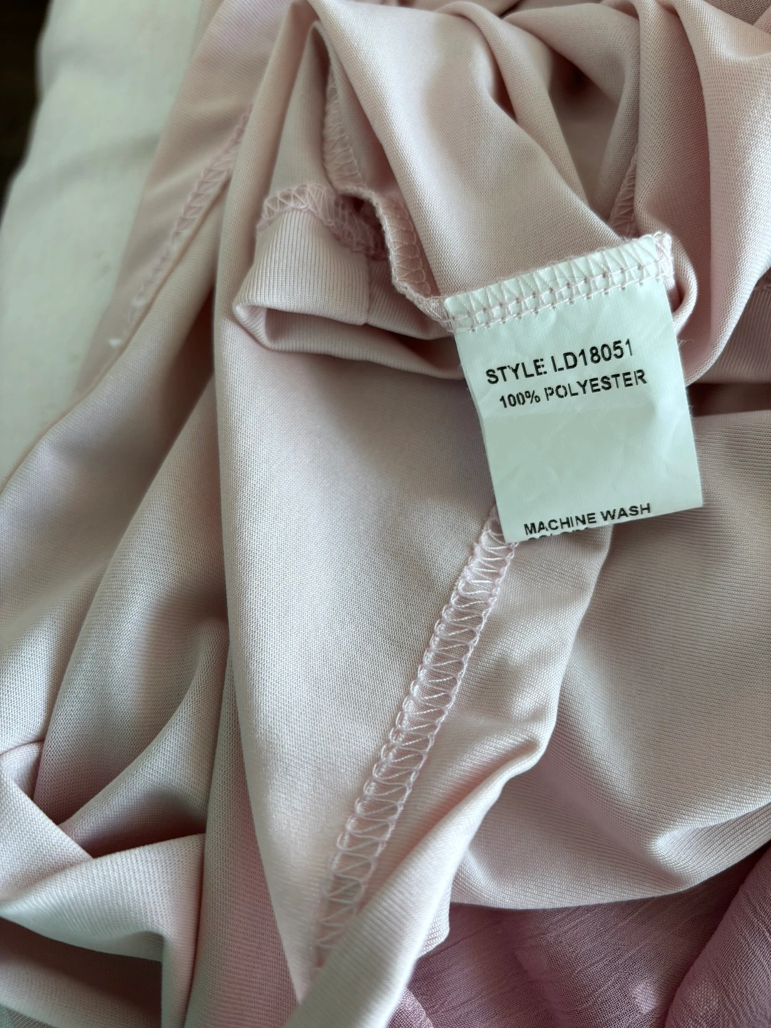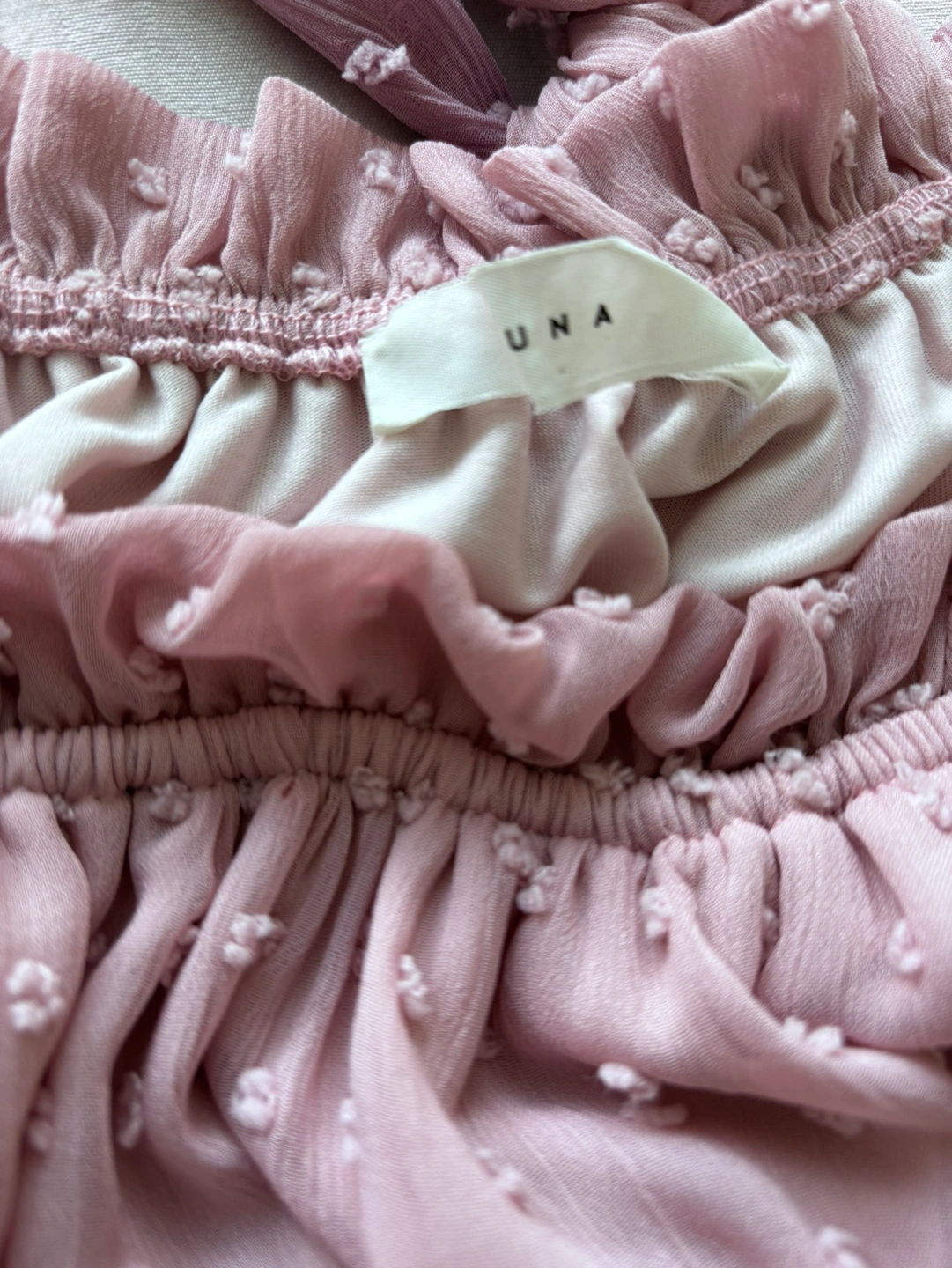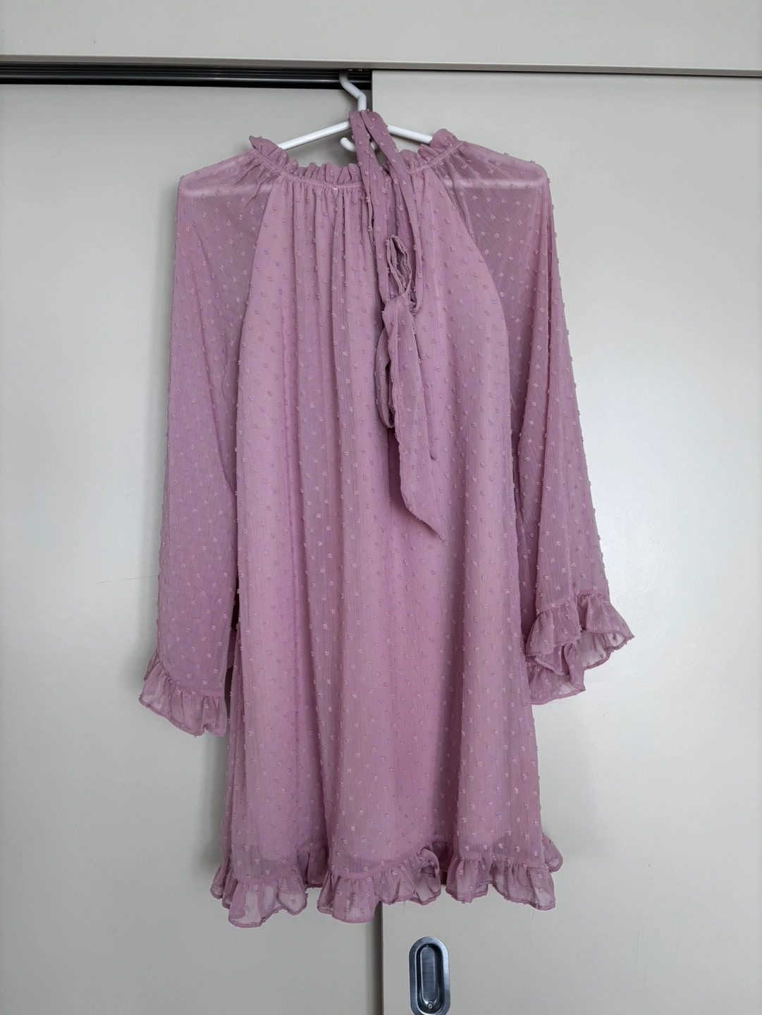 A lovely light pink dress with a swiss dot pattern and a belt. It has bell sleeves and a ruffle hem.