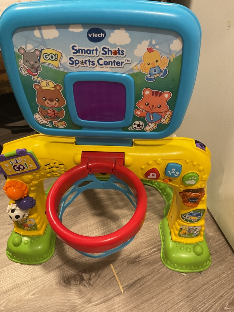 VTech interactive basketball game with light and sound. Includes various activities such as scoring baskets, playing music, and learning numbers. Spadina and Dundas