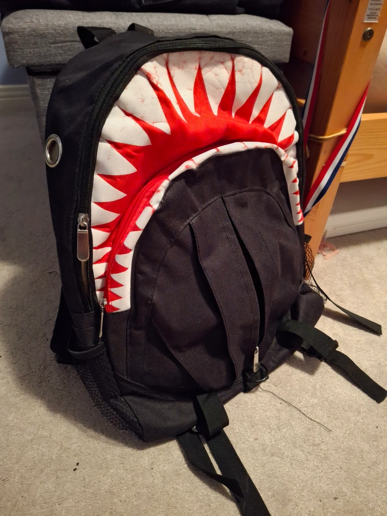 Used black backpack with a red and white shark mouth design. It has a large main compartment, a smaller one, and a front and 2 mesh side pockets for water bottles/umbrellas. Could fit up to a 15.6" laptop (best if you already have a padded sleeve). There are small holes in one of the side pockets and one of the strap buckles broke; still works fine if knotted. All zippers functional.