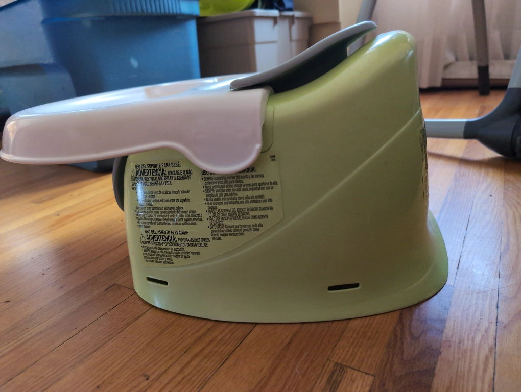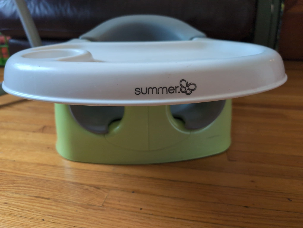 This is a Summer Infant Deluxe Elevated Feeding Seat in good condition. The chair has a tray with a built-in cup holder and a removable, adjustable safety strap. It is easy to clean and store. It is a great way to help your baby transition from high chair to table seating. The chair is green and white.