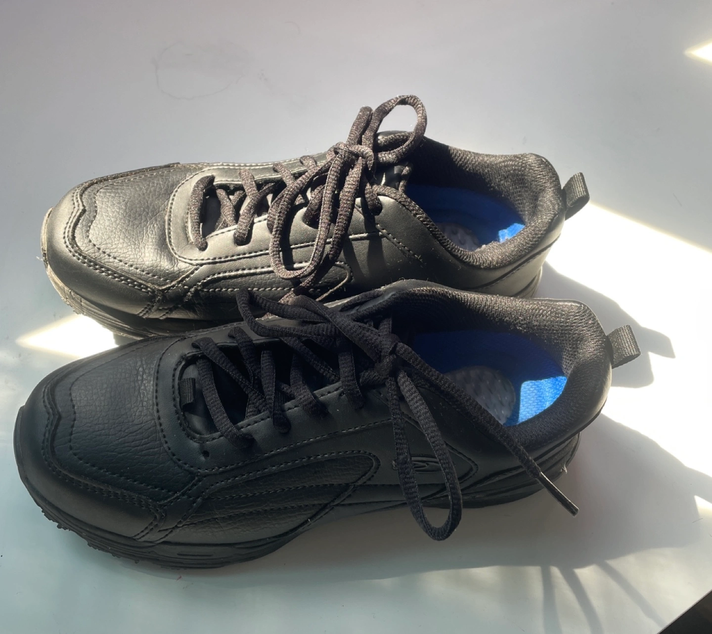 Size 6W black running shoes. They have a comfortable fit and are great for everyday wear. They are made of a synthetic leather material and have a durable sole.
