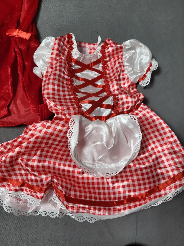 Red and white gingham dress with white lace trim, red ribbon, and a red hooded cape.