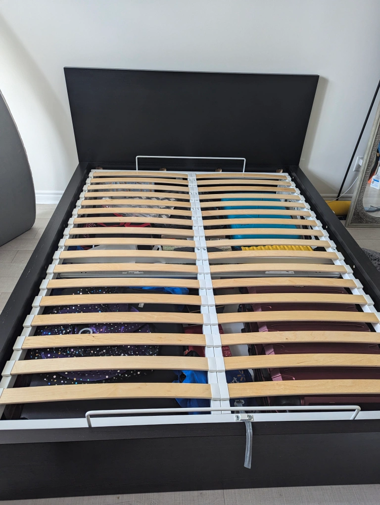 IKEA hydraulic lift-up queen bed with storage. blackish brown color and comes with plenty of storage. Available immediately.