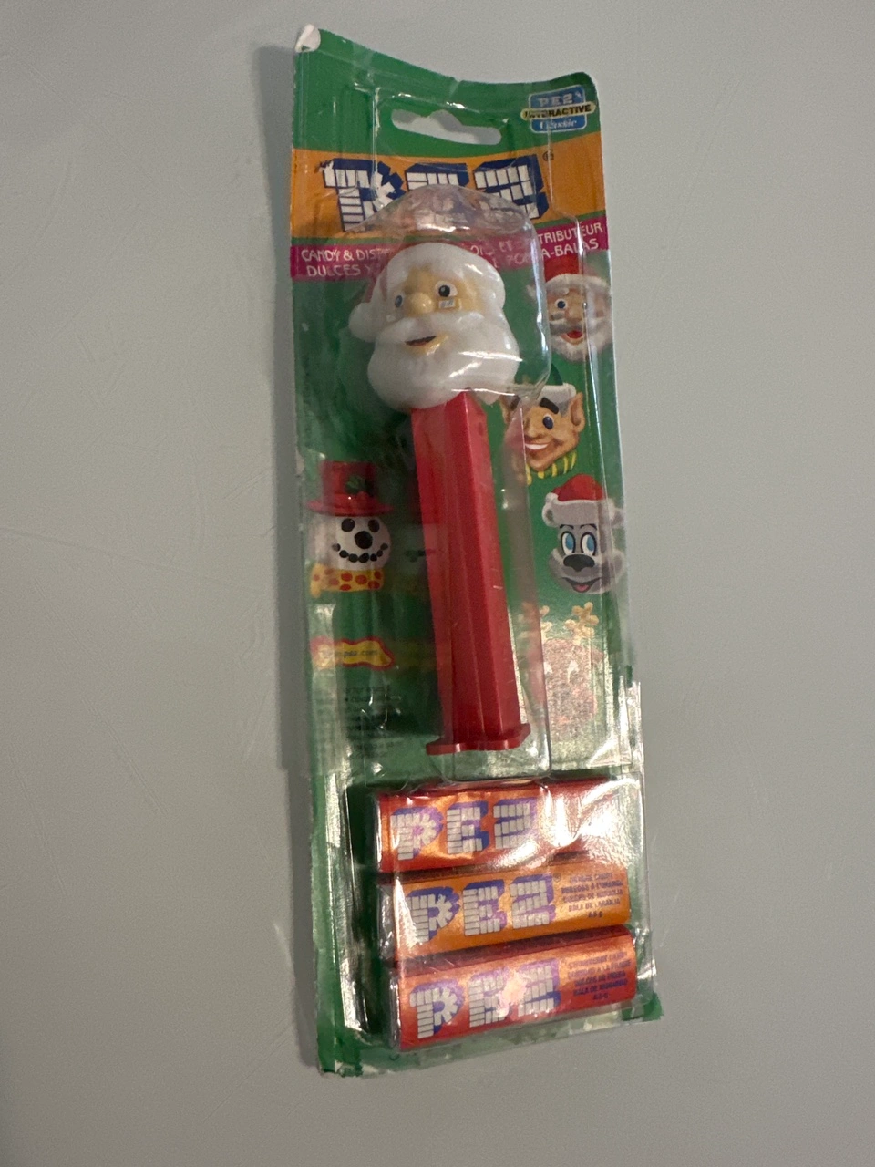 This is a vintage Pez dispenser of Santa Claus. It is new and still in its original packaging. The Pez dispenser includes 3 packs of Pez candy. The Pez dispenser is red with a white Santa Claus head. The packaging is green and has the word Pez in red letters with a Santa Claus image on the front. It also has images of other Christmas characters on the back. The Pez dispenser is in new condition and the packaging is in good condition. The packaging has some wrinkles and folds, but it is still intact. The Pez candy is still sealed in its original packaging. This would be a great addition to any Pez collection or a fun Christmas gift for a Pez collector.