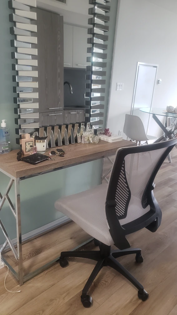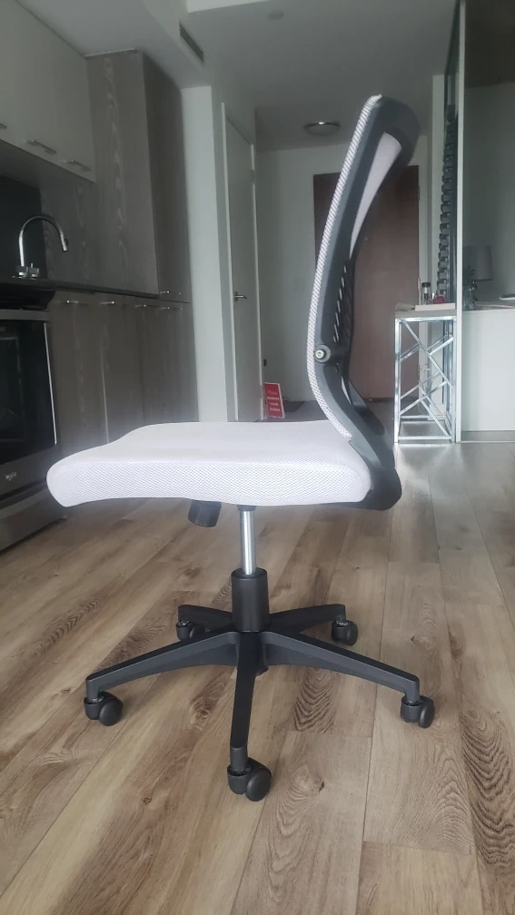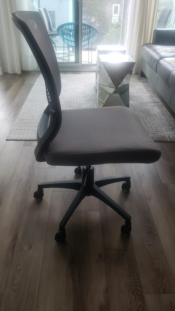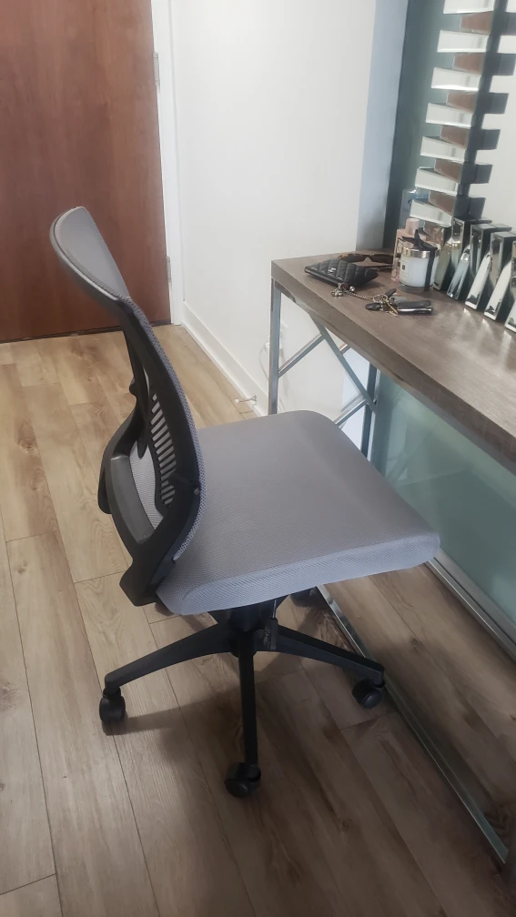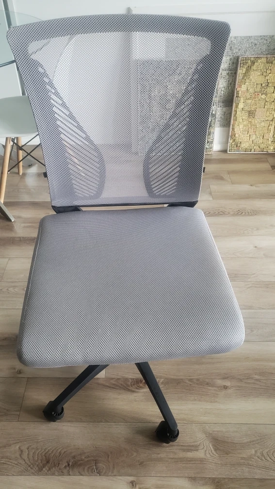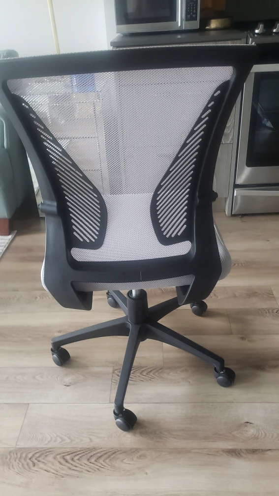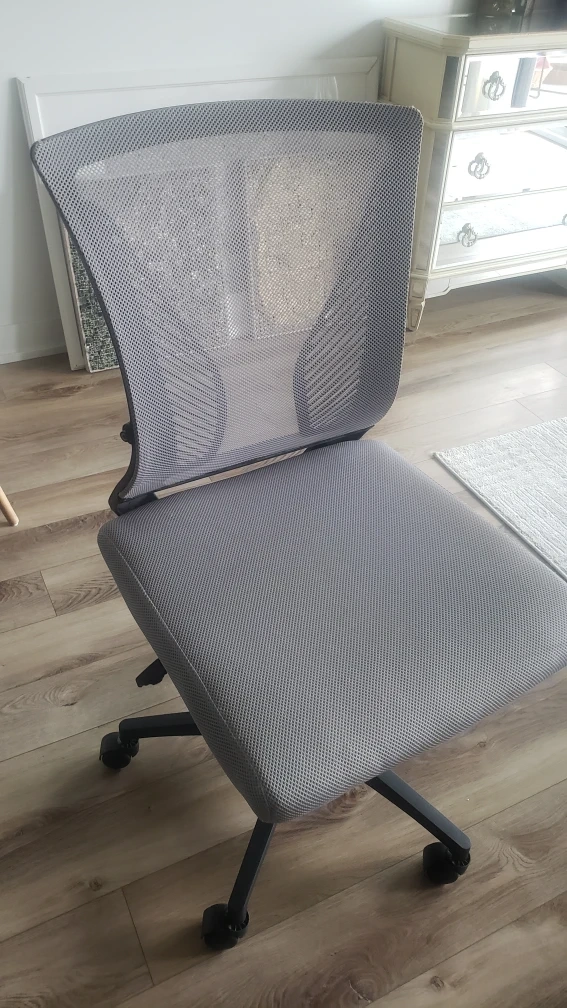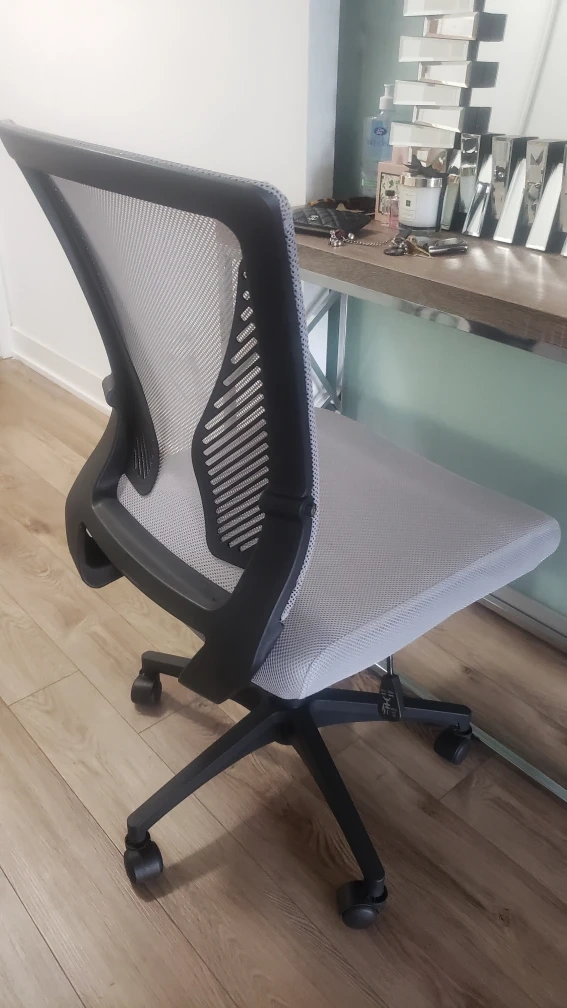 Light Grey mesh office chair with black frame and wheels. Adjustable height. Great for work or gaming.