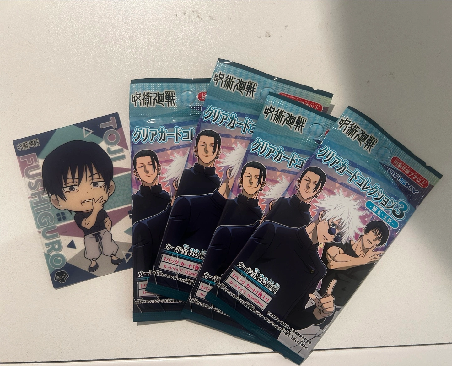 It’s the official Japan trading cards opened package is $3, trading available for maki and nobara. The other 4 are unopened