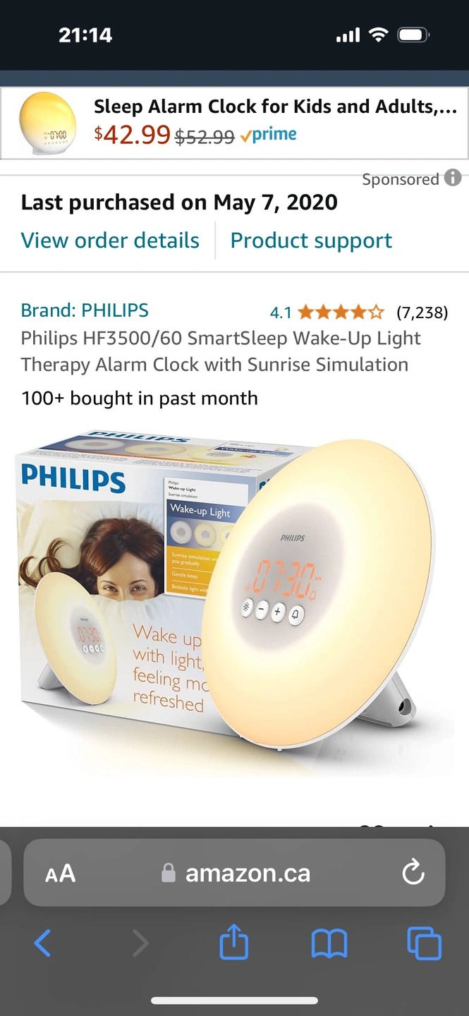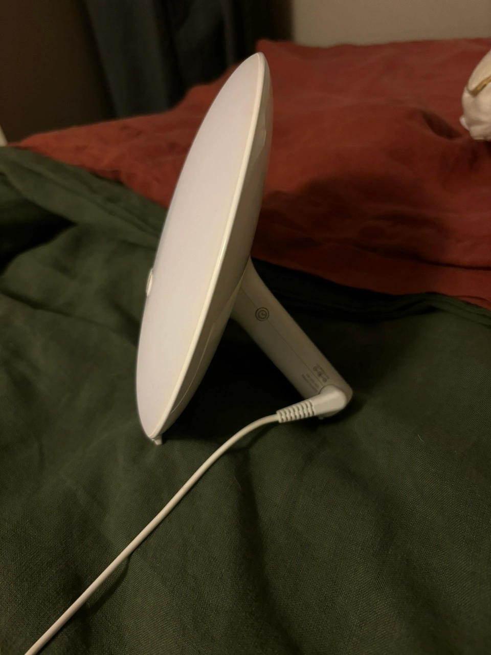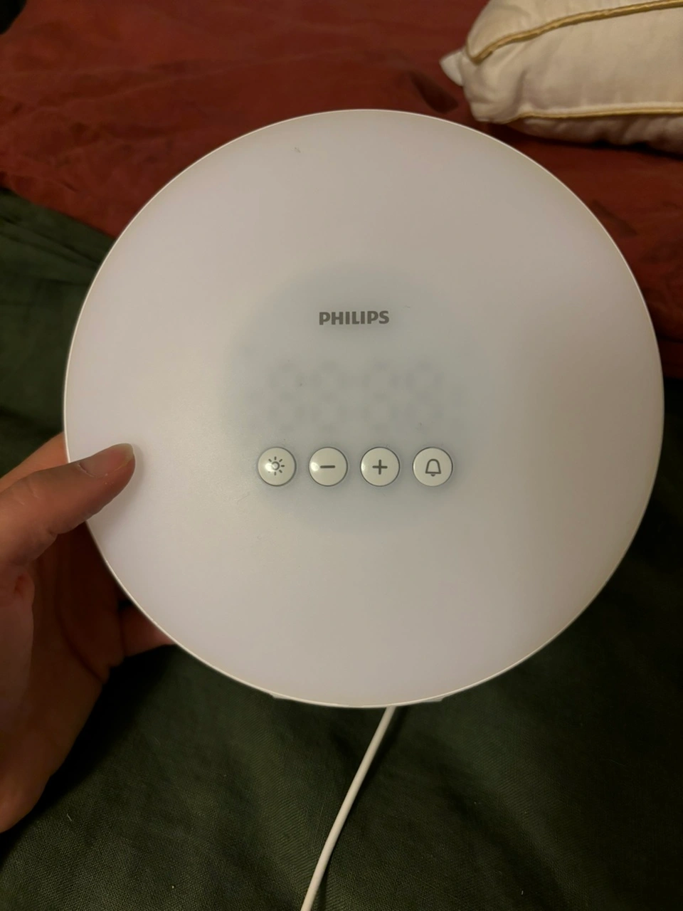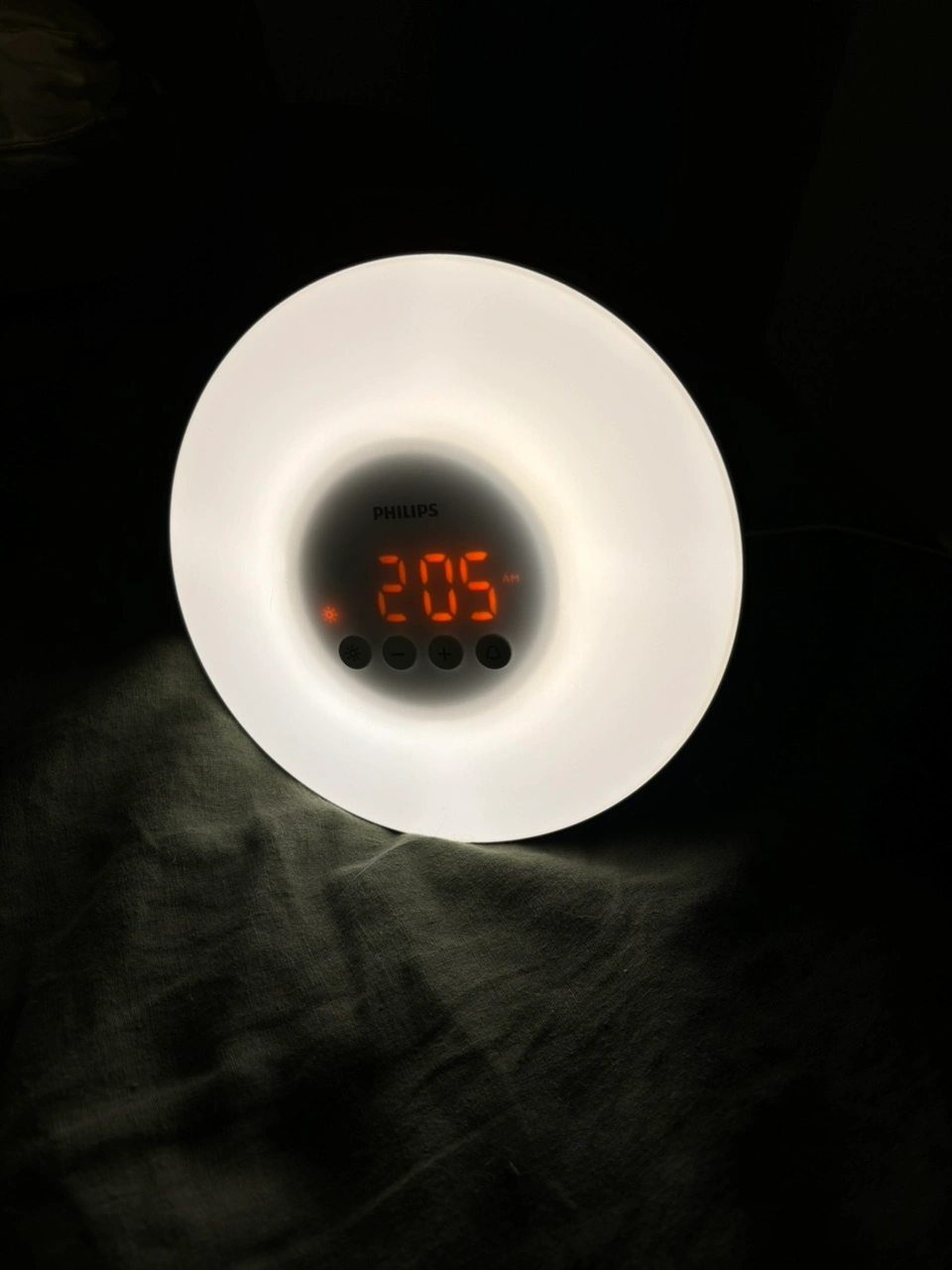 Sunrise Alarm clock with 10 brightness functions. Takes 30 minutes to slowly increase the light to wake you up. At your wake-up time the light is bright and a light beep will go off as a fail safe