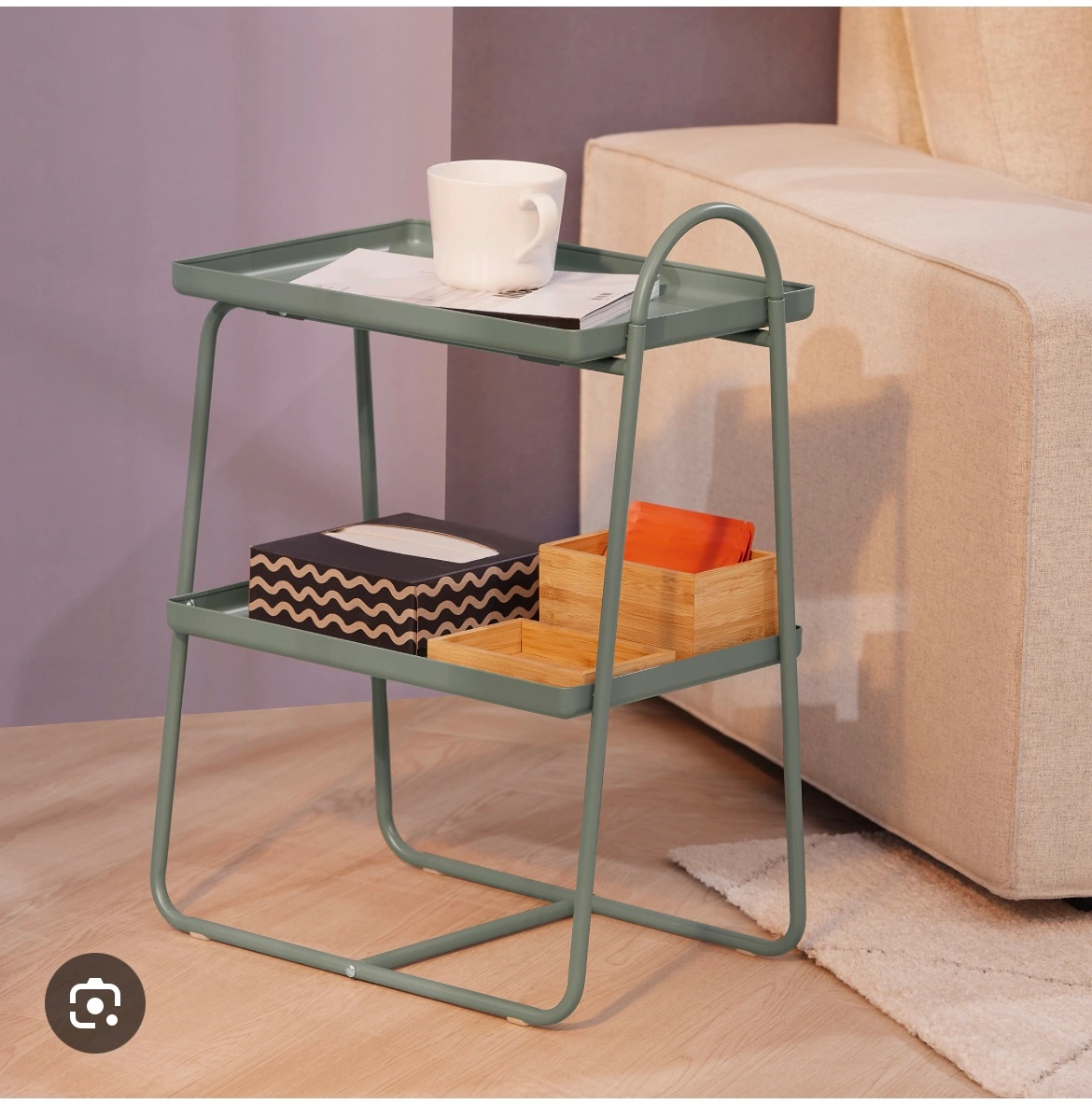 Green bedside table with two shelves.