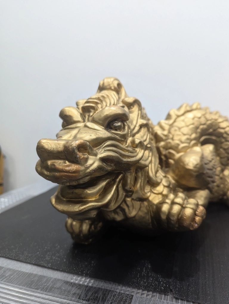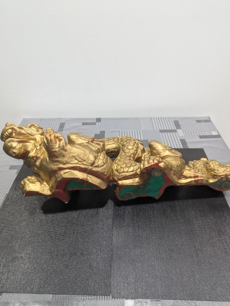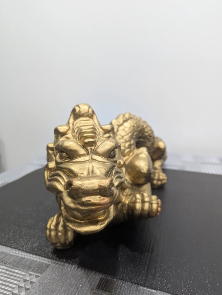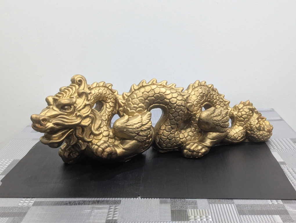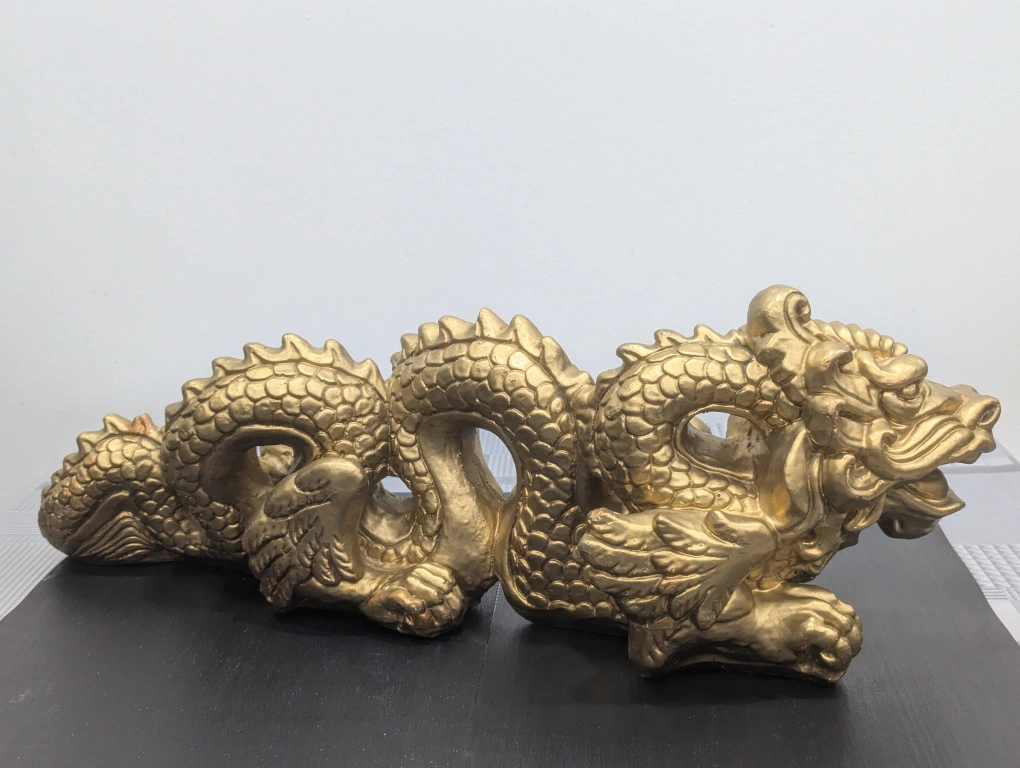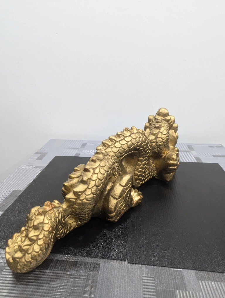 This is a detailed Large dragon statue with a gold finish, made from a hard material or resin. The statue features a dragon with wings and a long, curling tail. It measures approximately 24 inches in length, 8 inches in height, and weighs around 14 pounds.