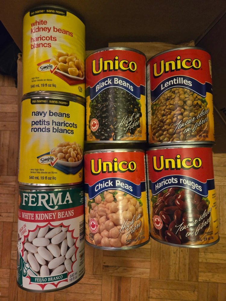 A collection of 6 canned beans from the brands Unico, NoName and Ferma. The cans all contain 540 ml and 19 fl oz.