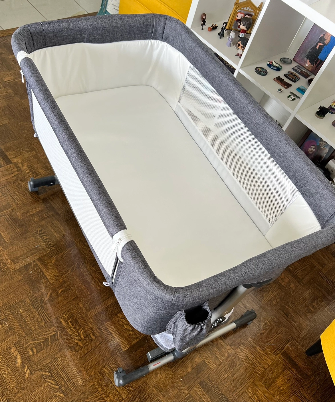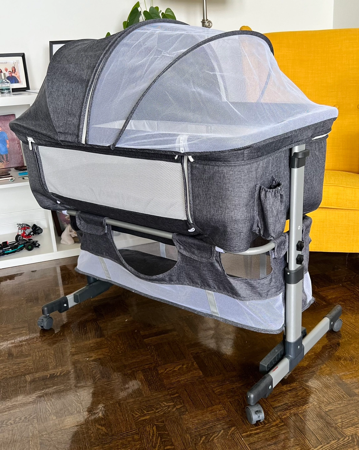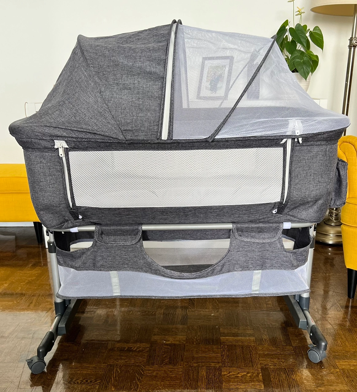 Grey crib with mosquito net and storage compartments. Includes instructions.