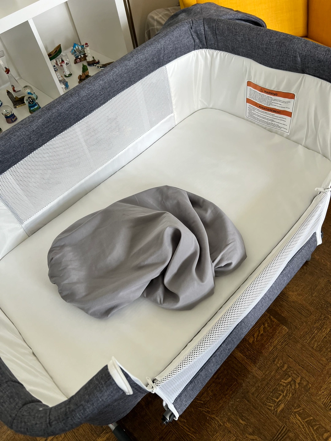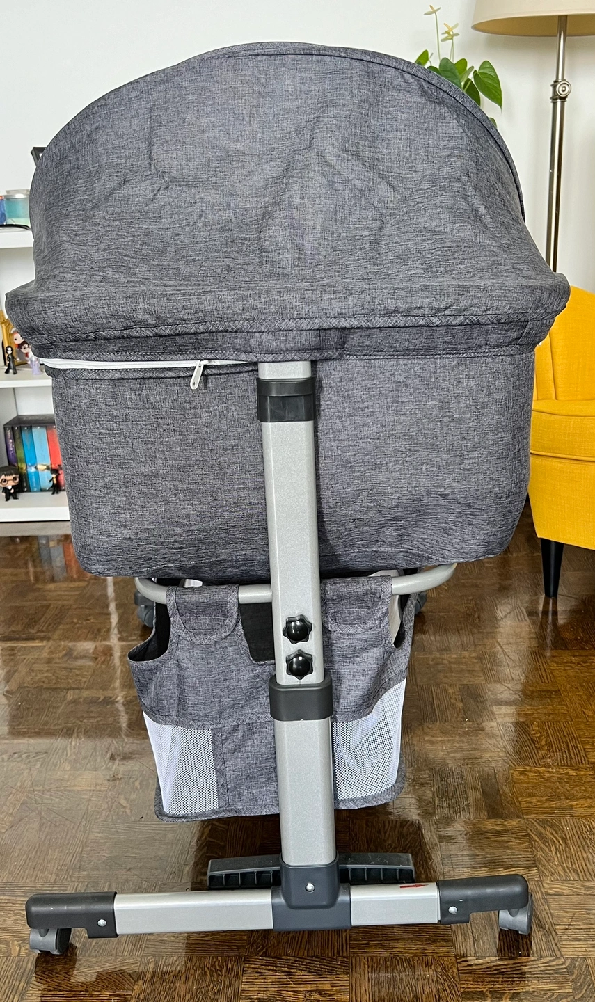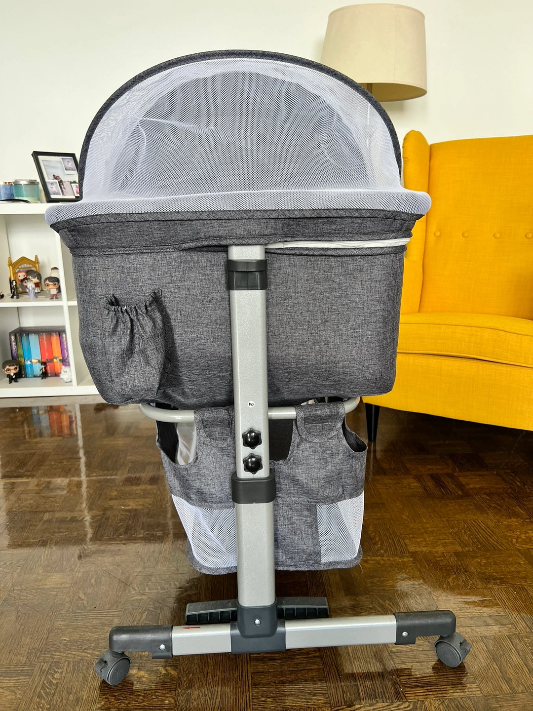 Grey crib with mosquito net and storage compartments. Includes instructions.