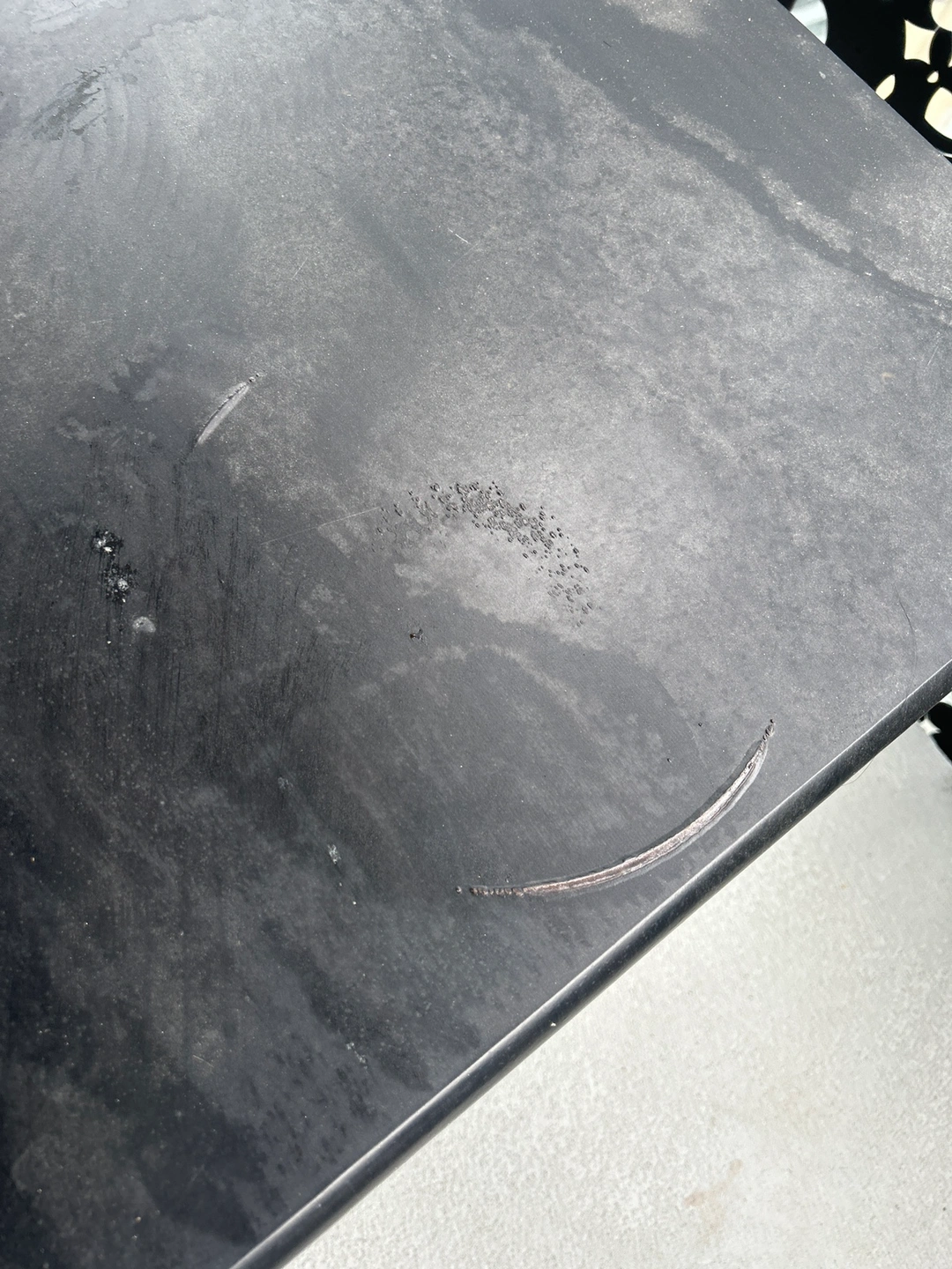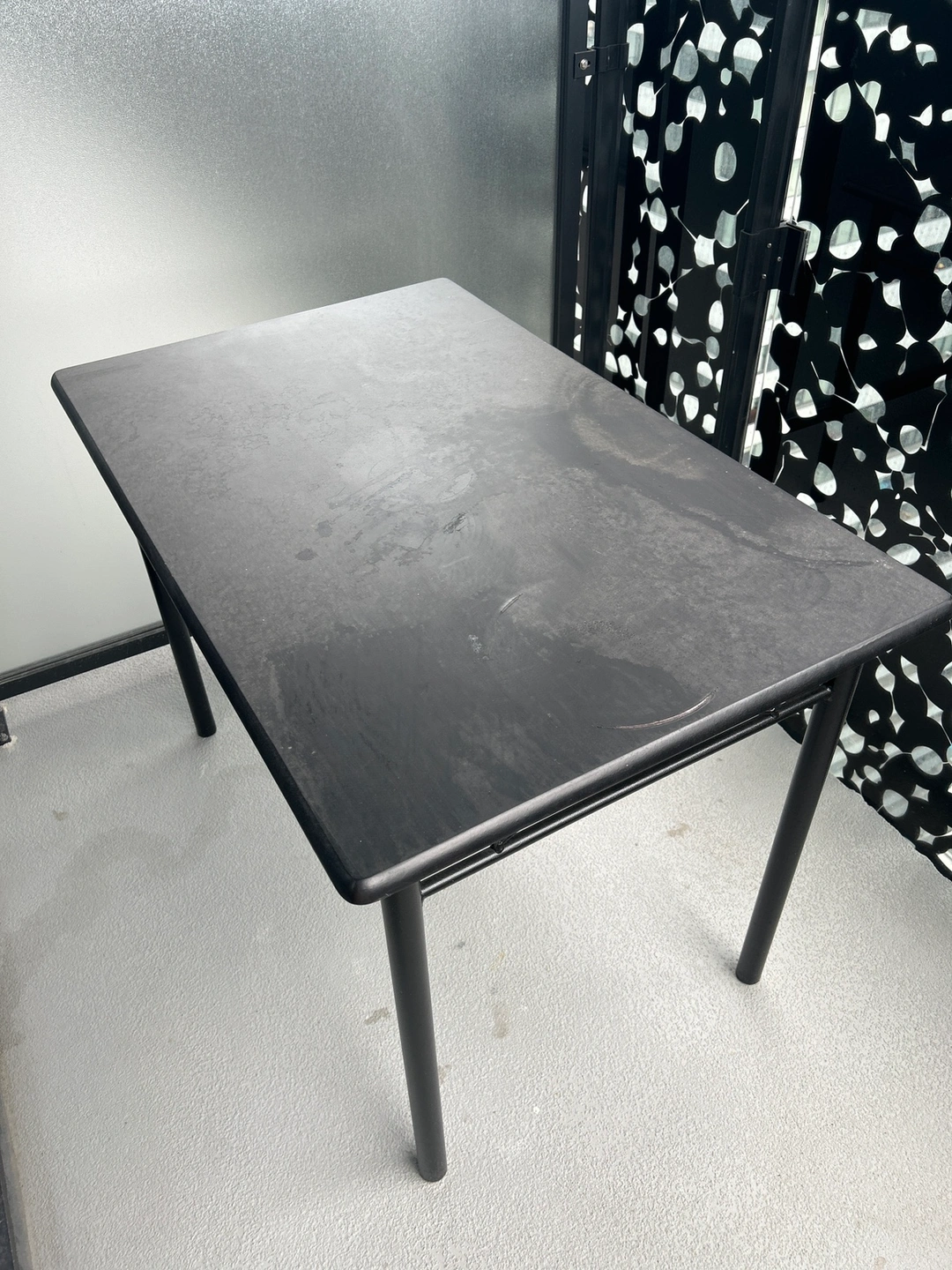 A black patio table with metal legs. Perfect condition except for one stain in the picture