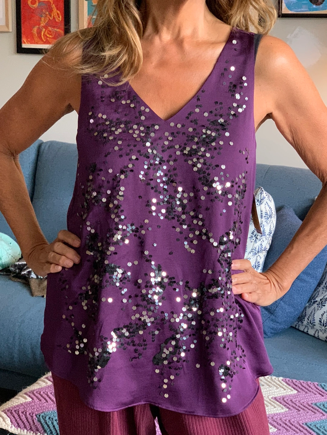 - Sleeveless deep purple tank top with black and silver sequins.