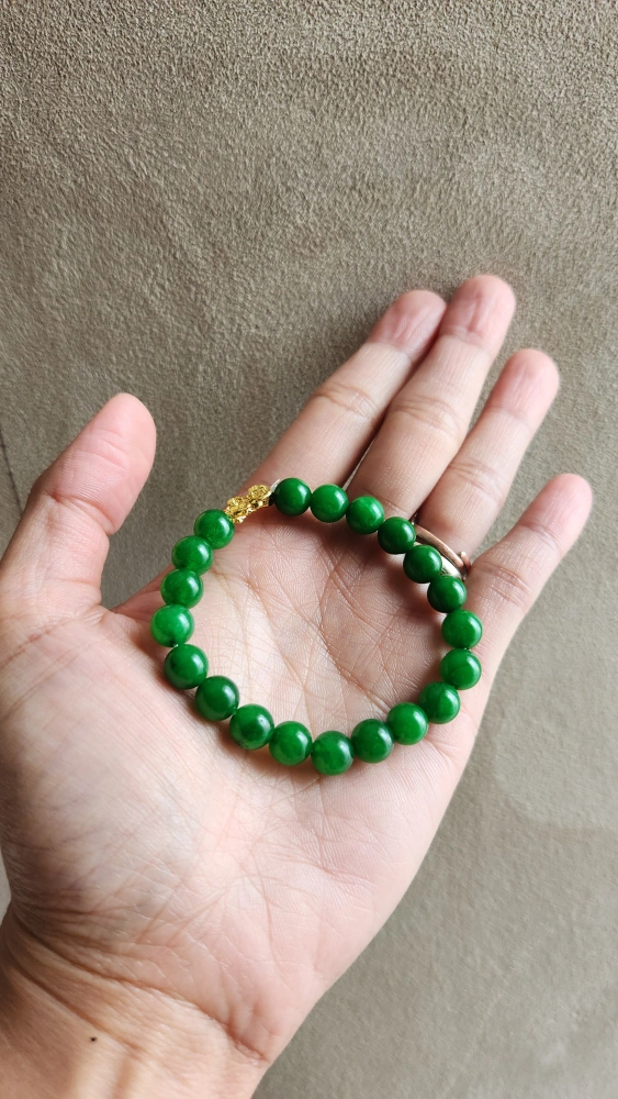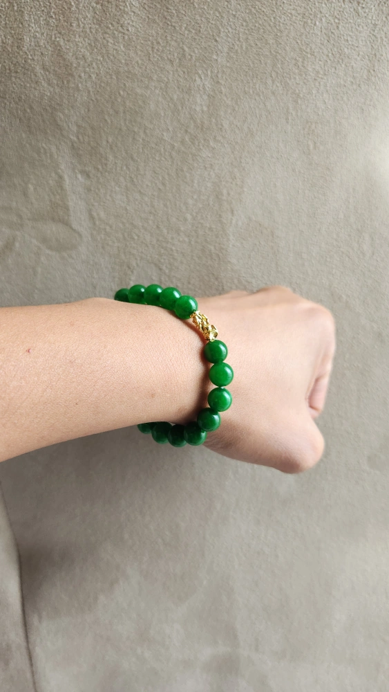 Jade Piyao Bead Bracelet bead size : 6mm Gold dragon : 1cm Gold : 18k gold stamped AU750 (not plated) wrist size : 5" cash and pick up only