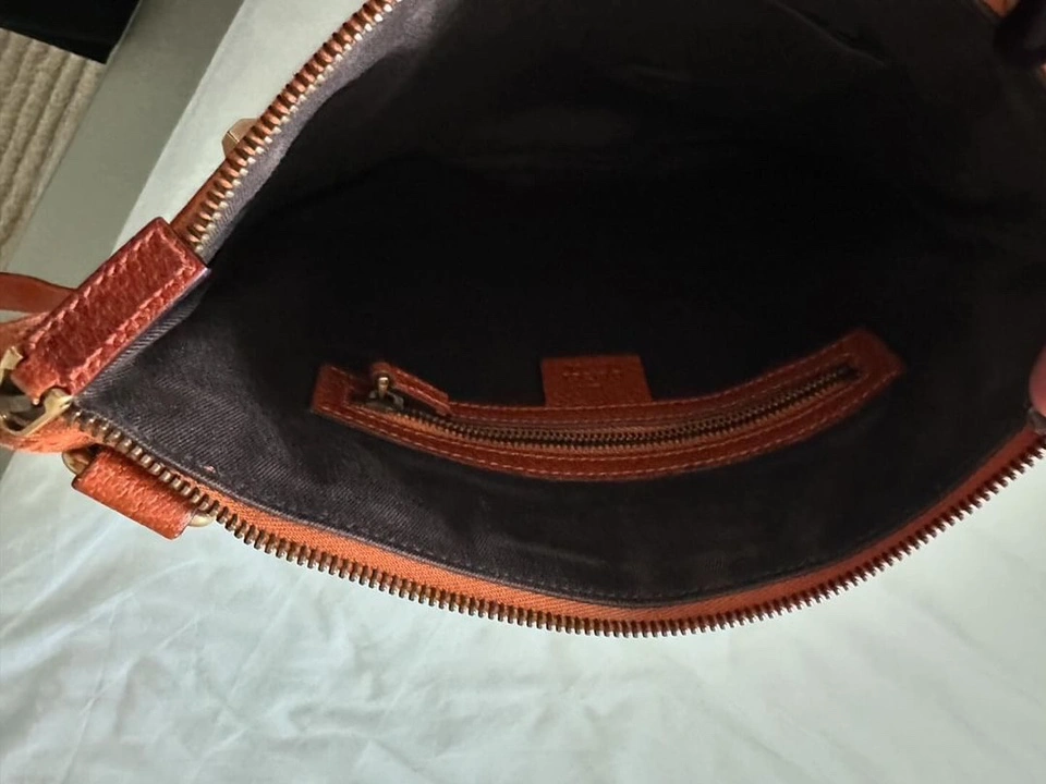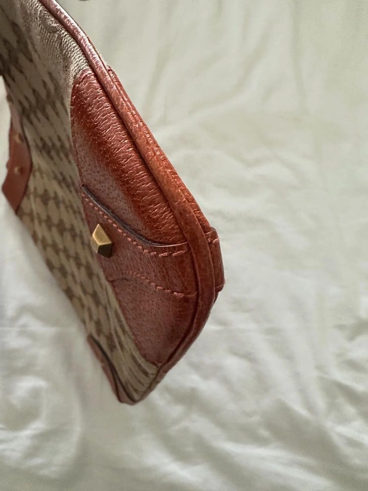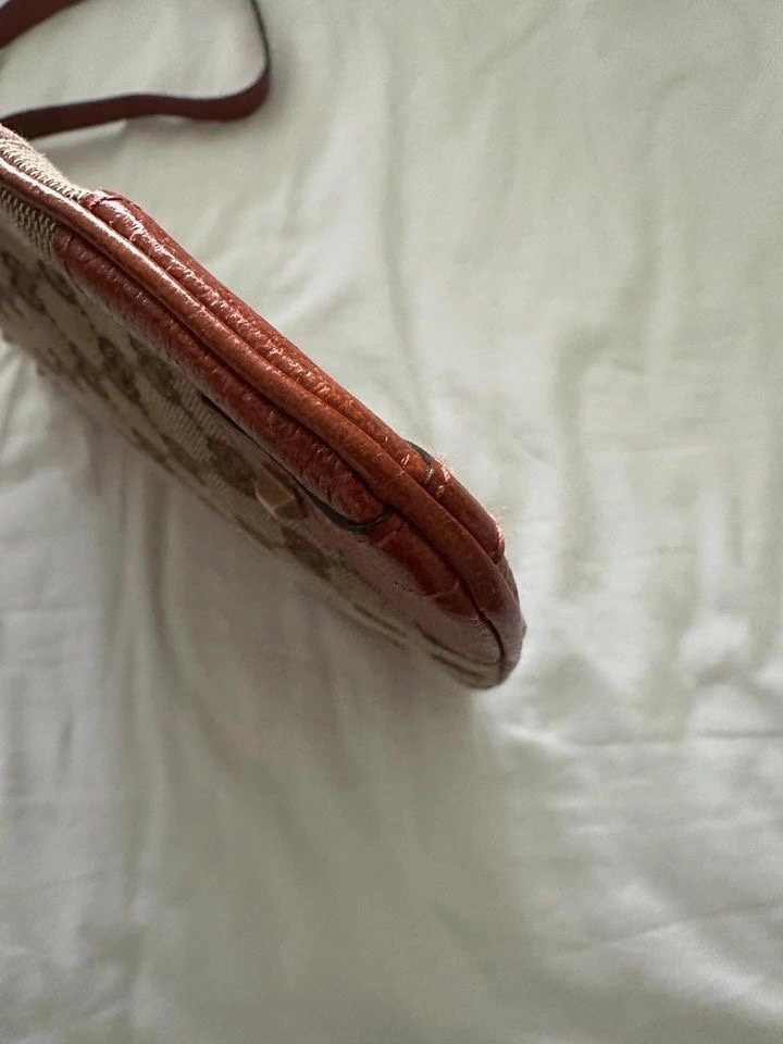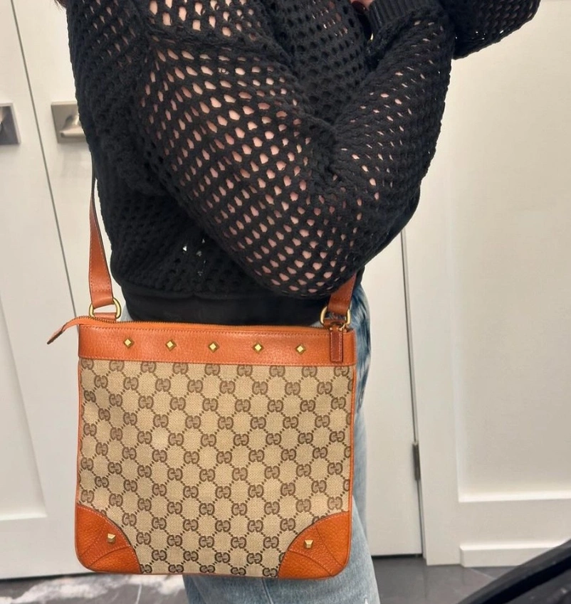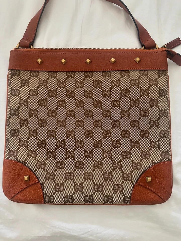 This small Gucci GG monogram crossbody bag features brown canvas with brown leather trim. The bag has a zipper closure, crossbody strap and gold stud details. It is in excellent pre-loved condition. Like new.