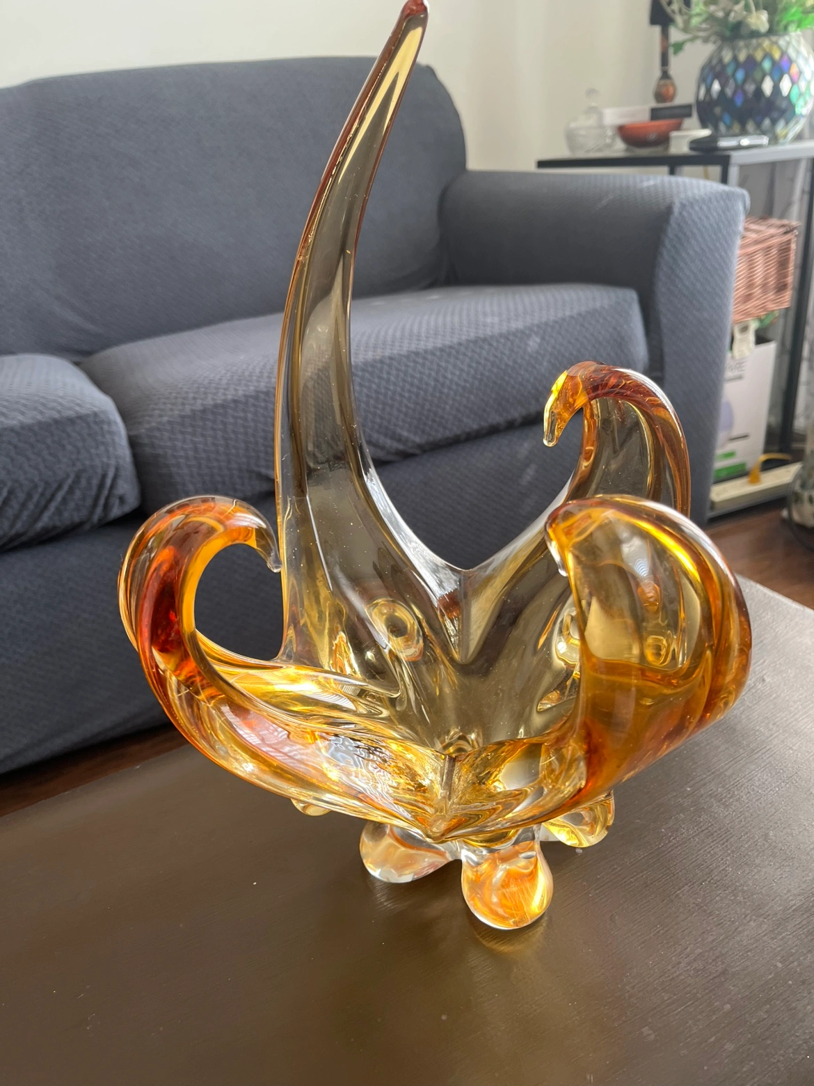 A beautiful amber coloured glass bowl. It would make a great statement piece in any home.