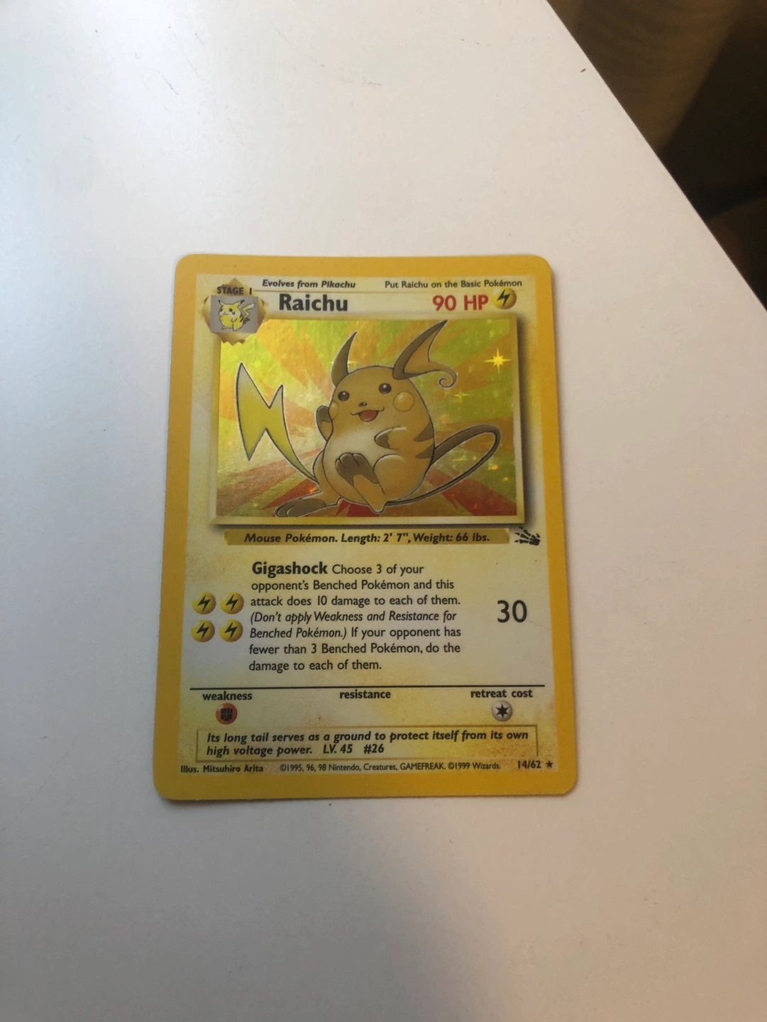 Raichu holo rare from the fossil collection of Pokémon cards. A bit moderately played but still looks really good.