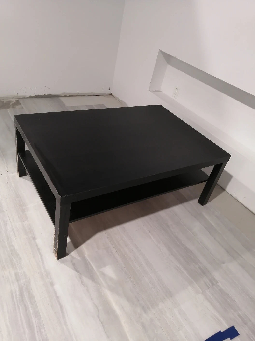 A black coffee table with a bottom shelf. It has four legs and is in good condition. It would make a great addition to any living room.