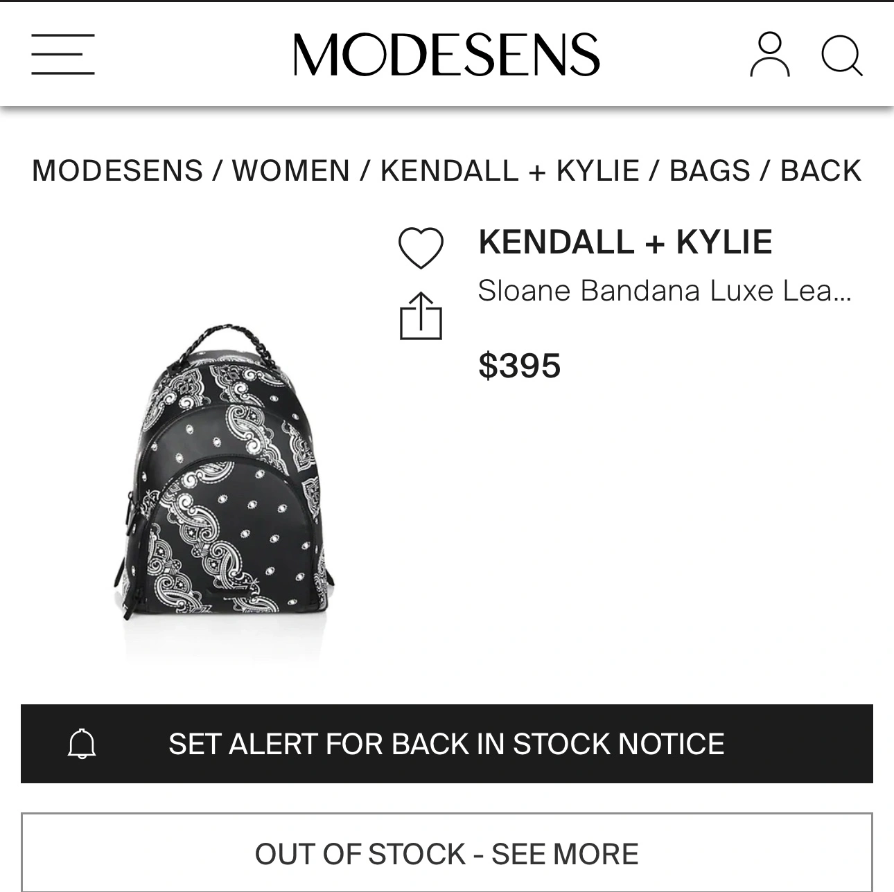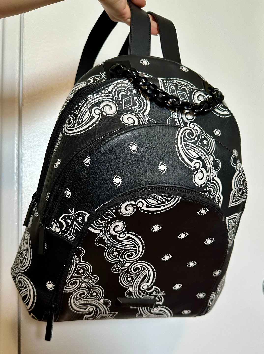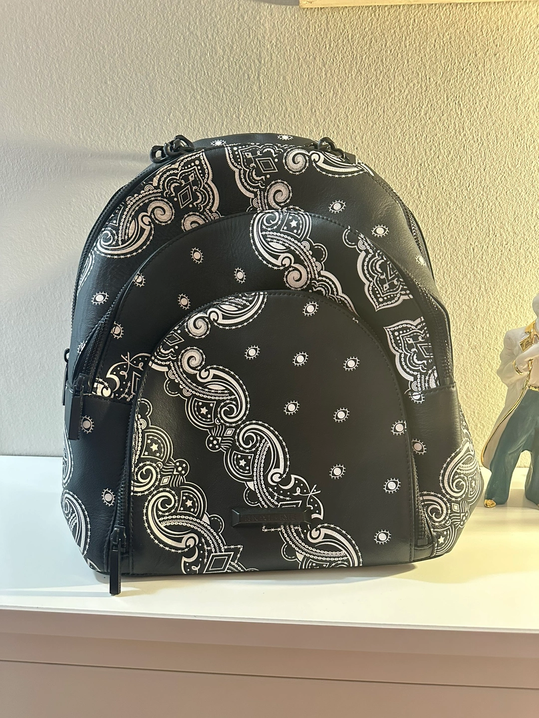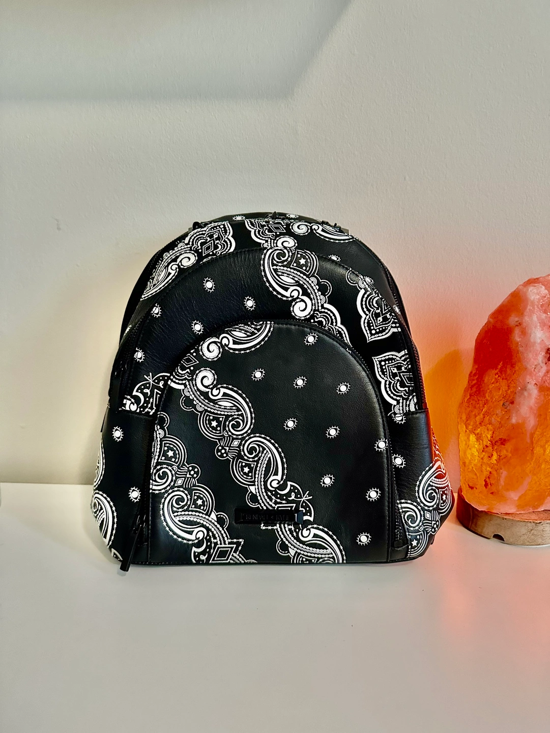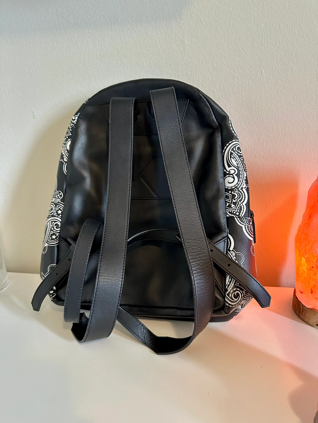 430In great condition. A black backpack with a white bandana print.