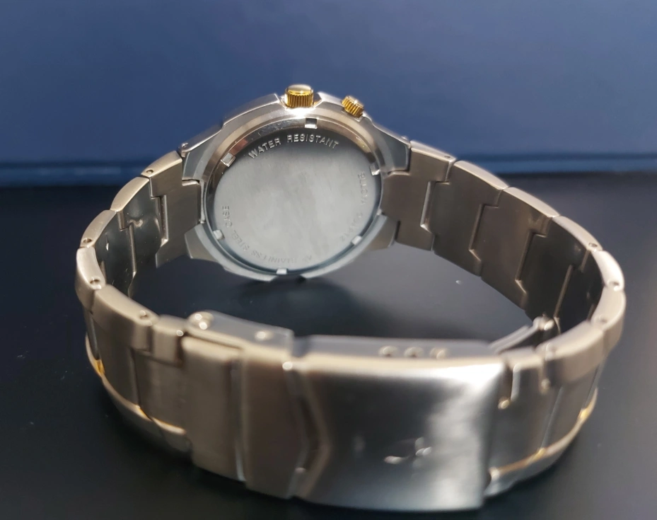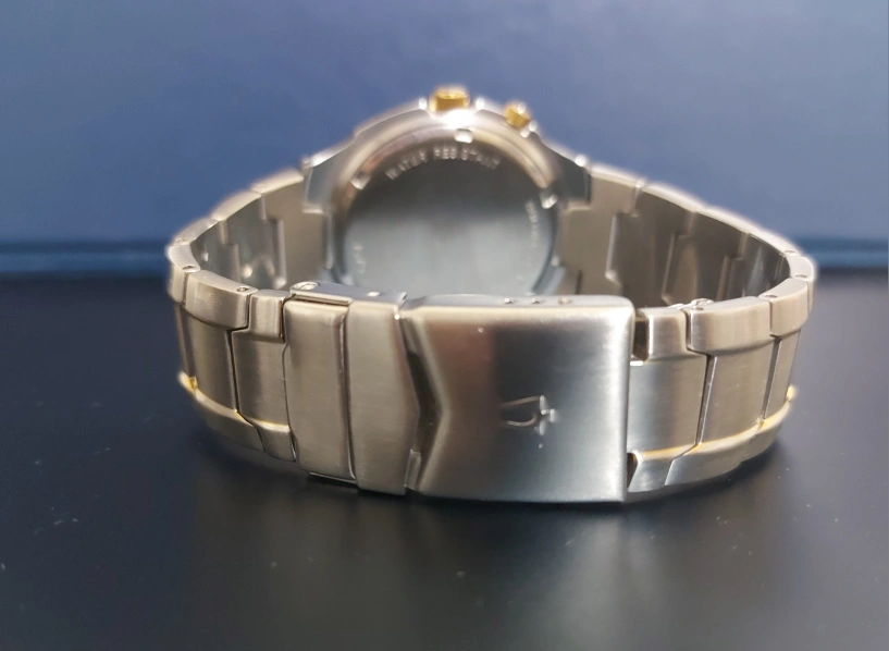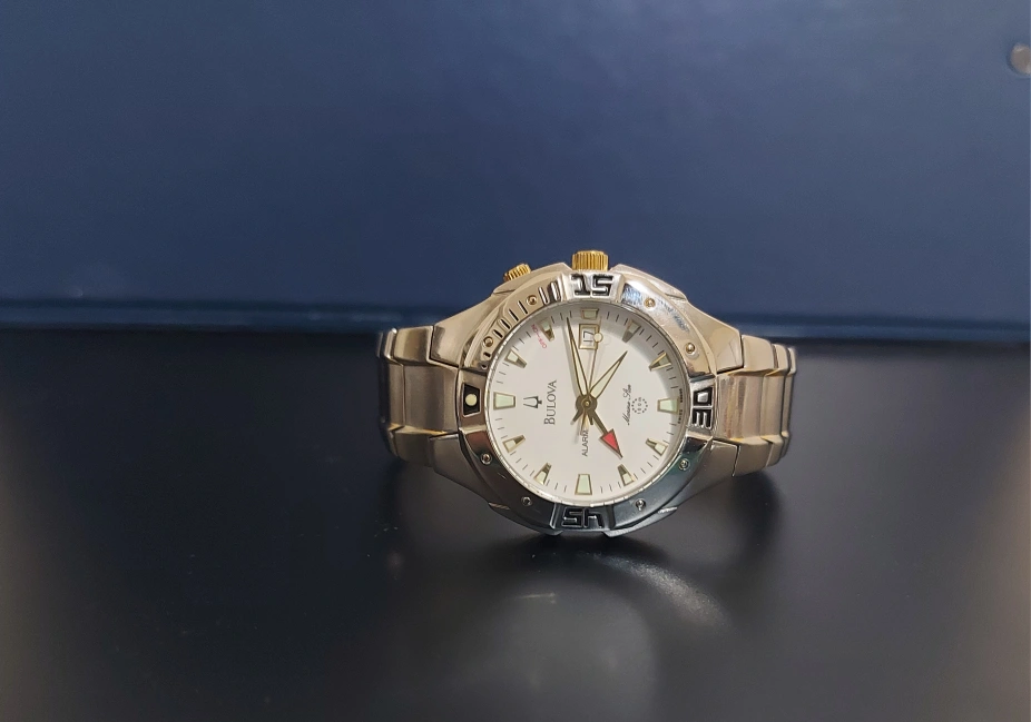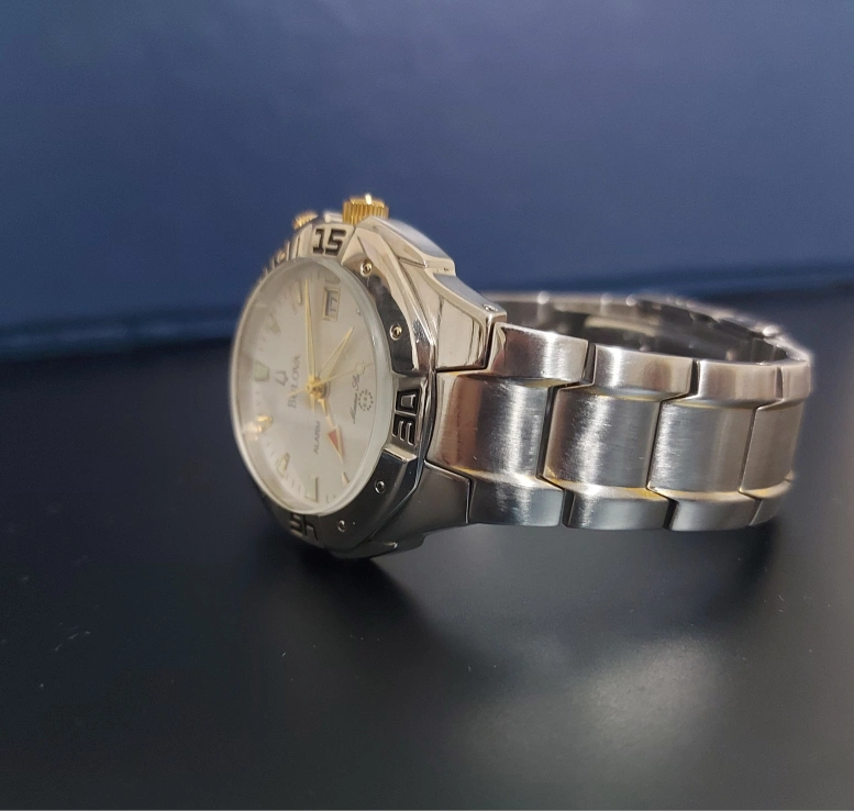 This is a Bulova men's watch with an alarm. It has a silver and gold stainless steel band and a white face. The watch is in working order.Its worth of 700 cad plus.still in box