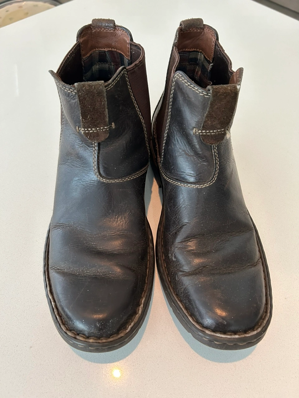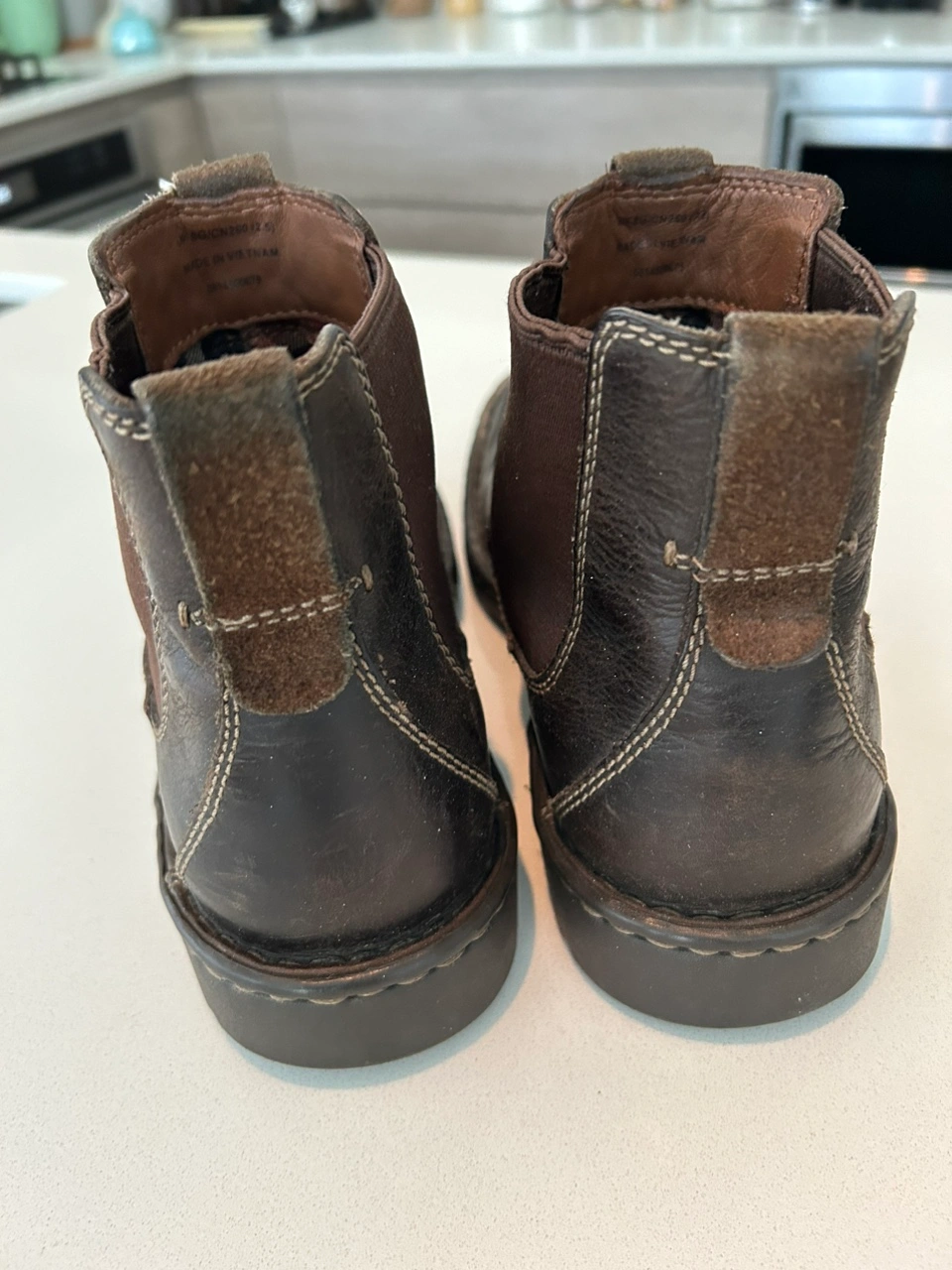 These boots are a dark brown leather. They have a pull-on style. They are a size 10. They have a rubber sole. They are preowned condition but years of life left. Great throughout winter too!