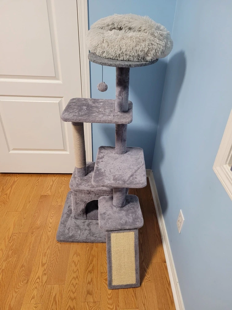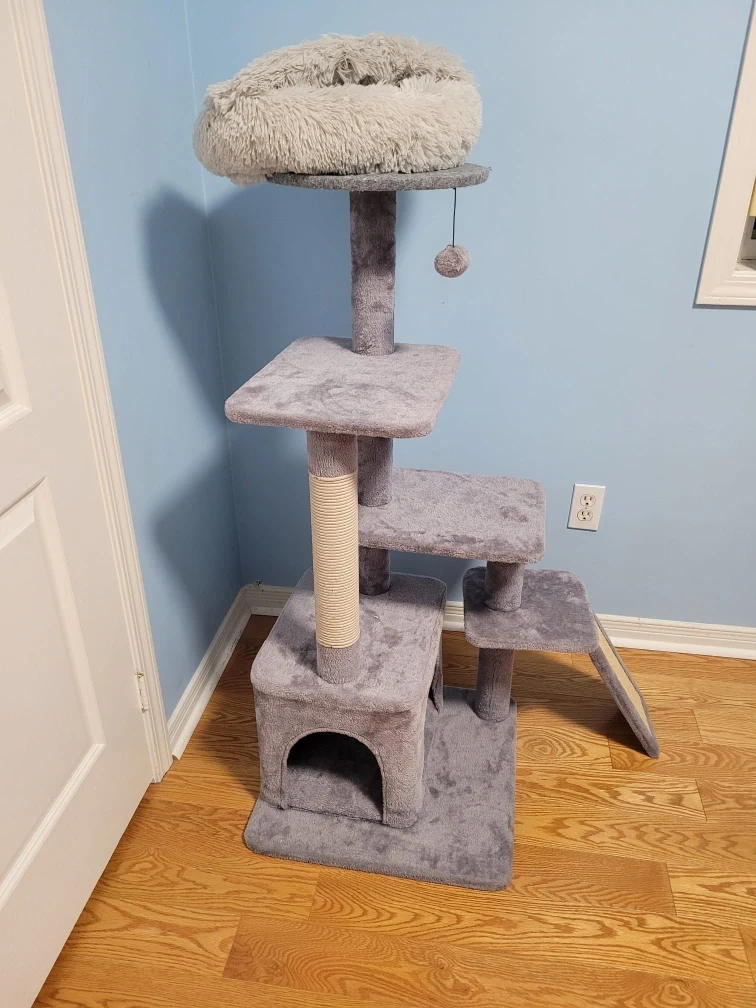 A grey cat tree condo with multiple levels, a scratching post, and a bed on top. It has a ramp and a dangling toy. It is in good condition. The scratching post is made of sisal. There is a small hole in the top bed.