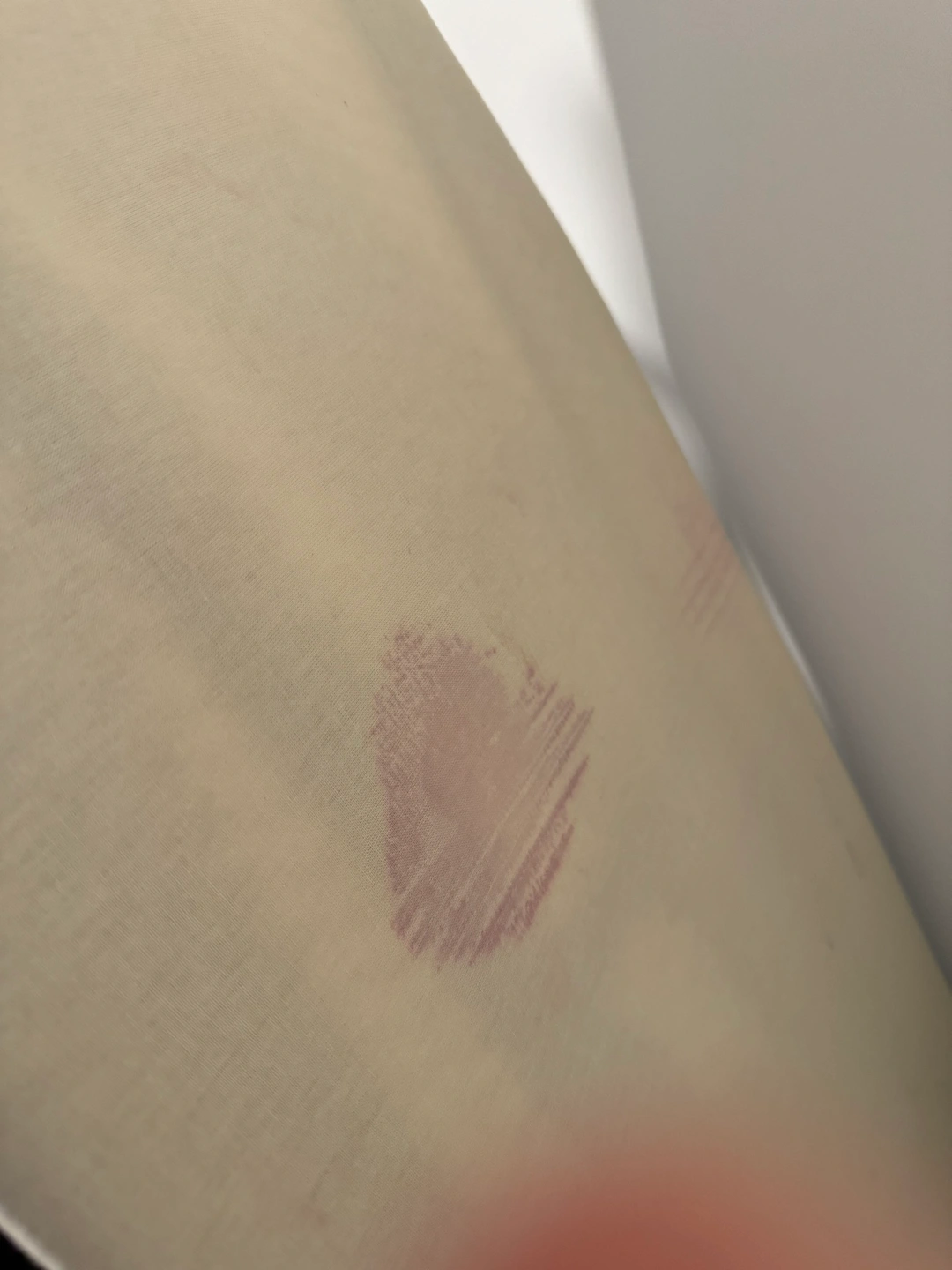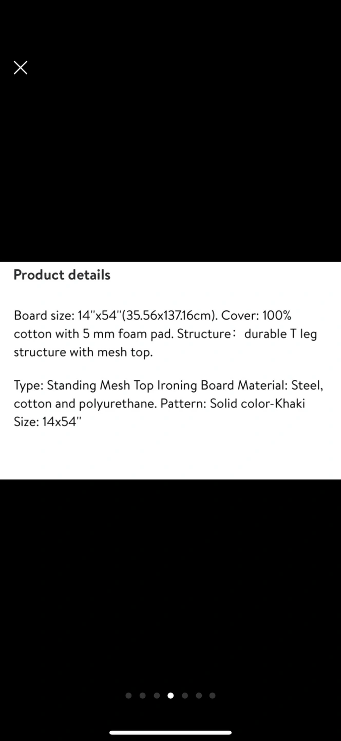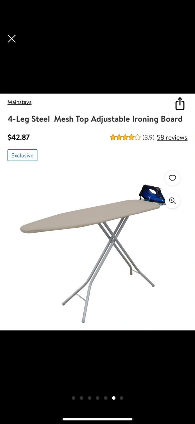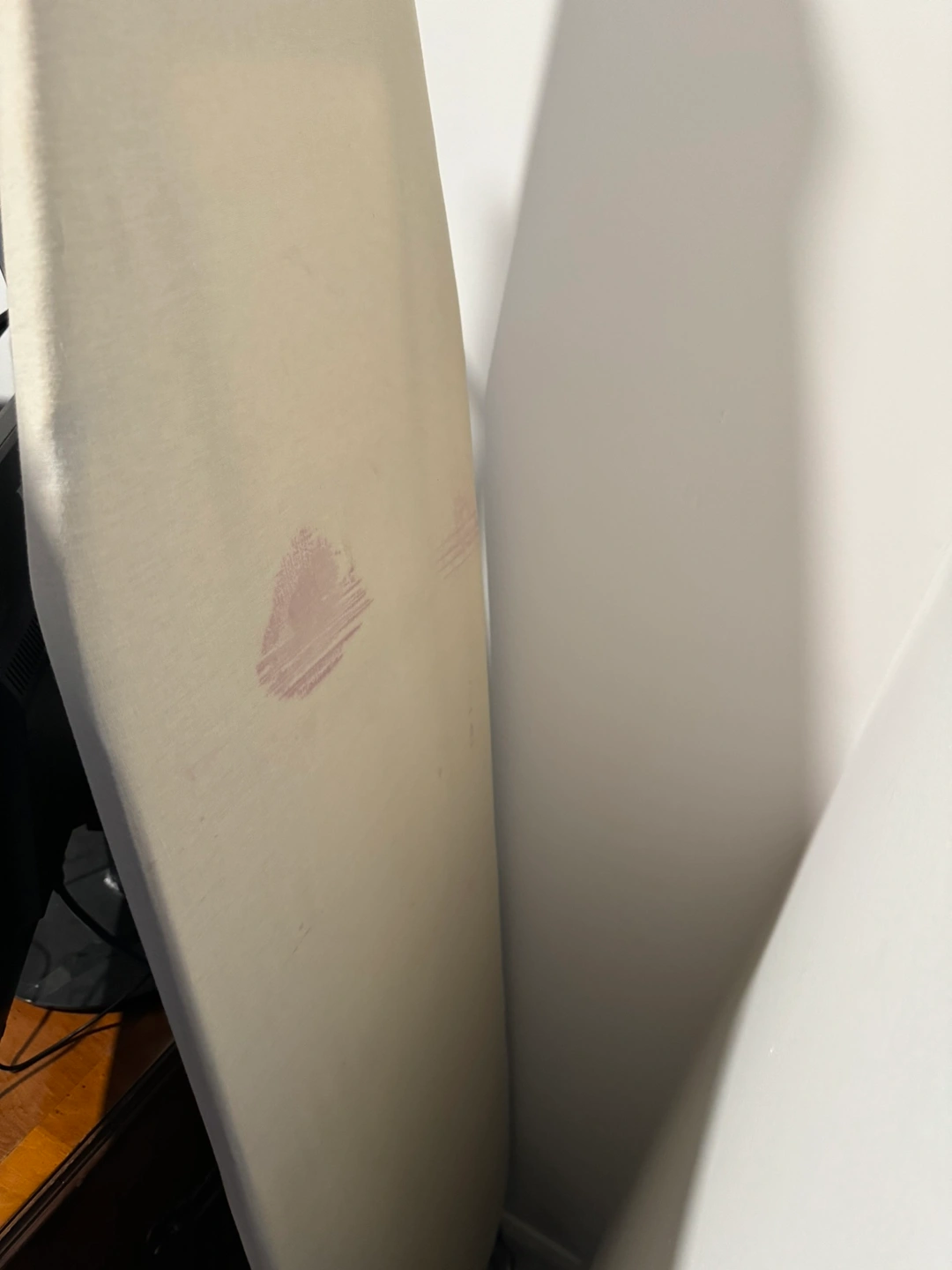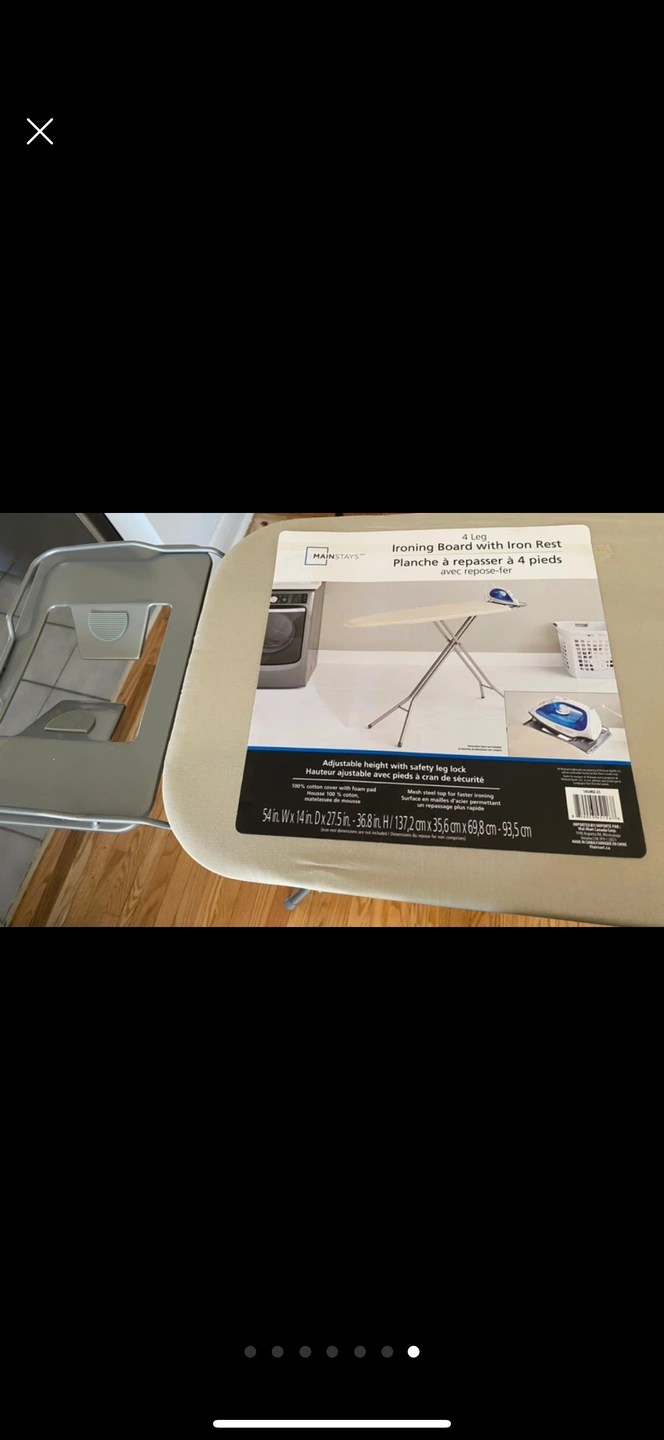 Ironing board with a mesh top, adjustable height, and an iron rest. Barely used , got a small patch of red stain, rest great condition .