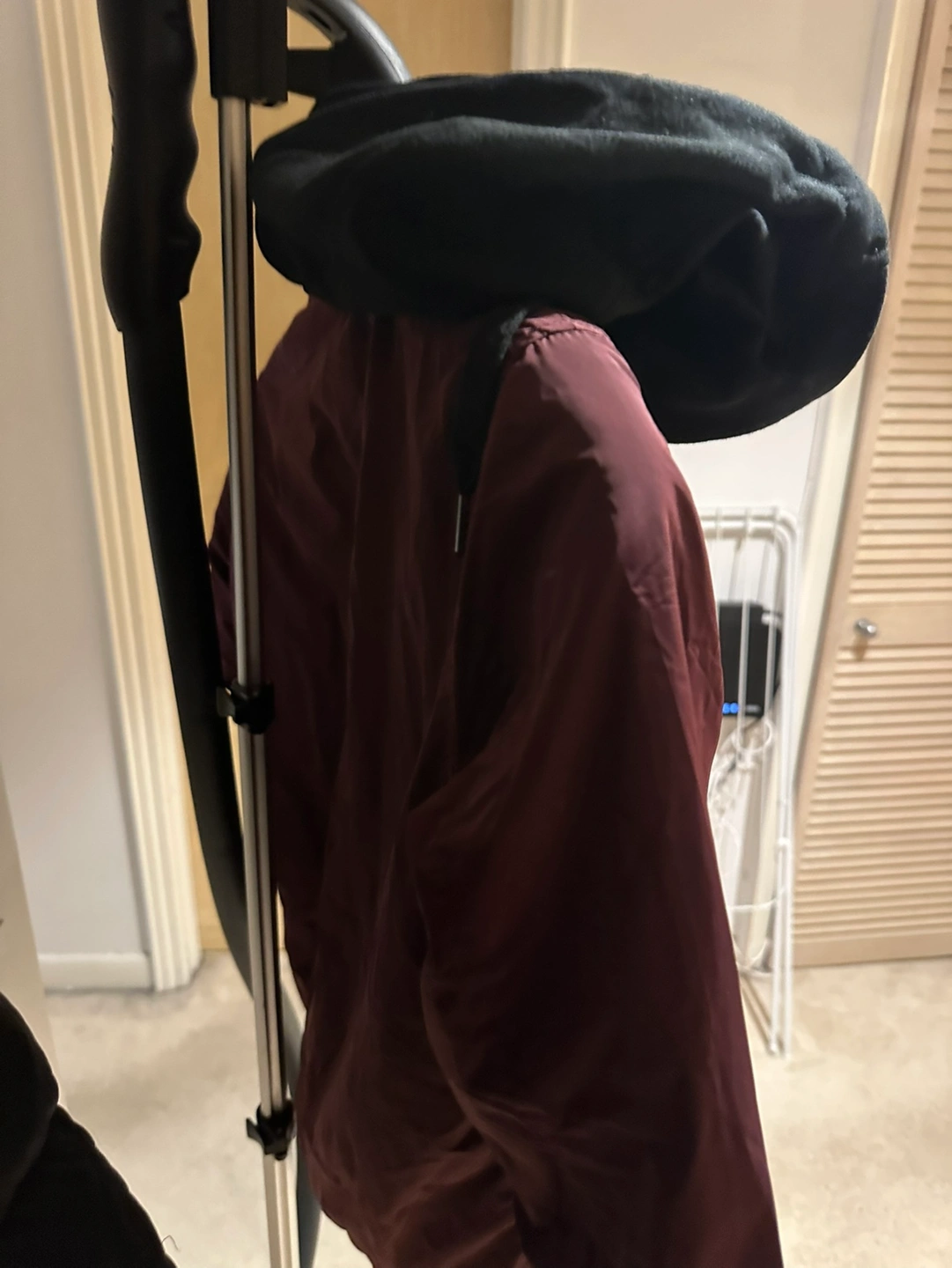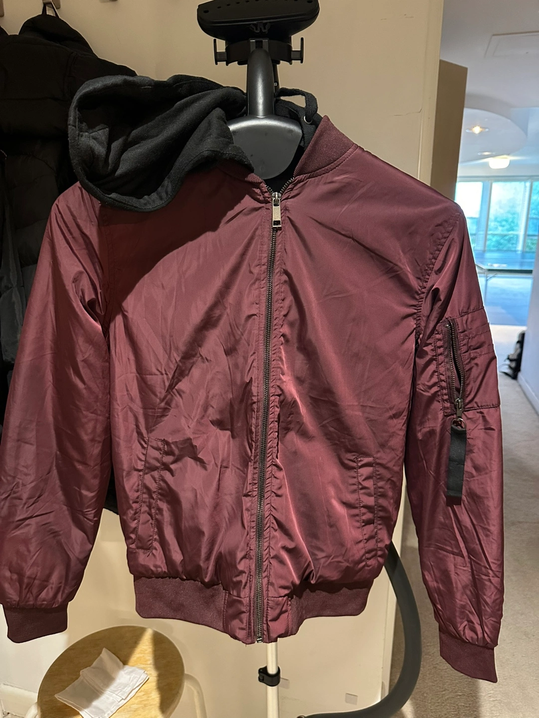 A burgundy bomber jacket with a zipper closure and a removable black hoodie. It has a zippered pocket on the left sleeve and a small pocket on the right sleeve.