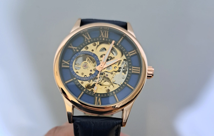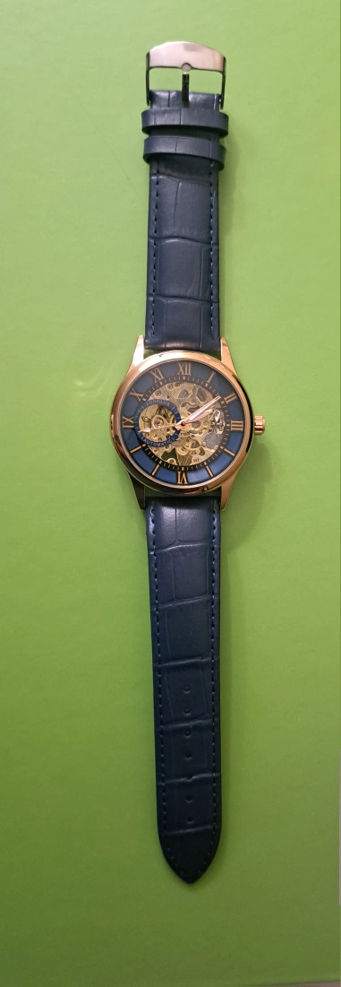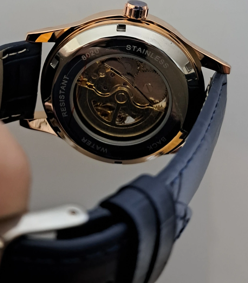 This watch has a rose gold tone case with a blue face. It features a skeleton design with a see-through back. The watch is on a blue leather band.
